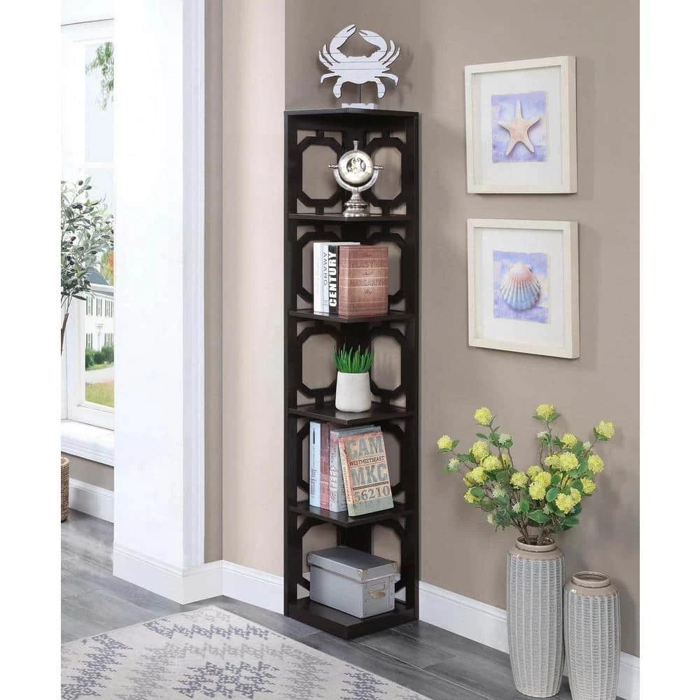 Completely transform an unused corner with the help of the Omega 5 Tier Corner Bookcase by Convenience Concepts. Featuring a contemporary style, this spacious corner tower will update your home decor and optimize your storage and display capacity. With geometric side designs, it will bring a fashionable and unique look to any room in your home. Boasting 5 ample shelves, this furniture piece provides enough space for all your books or favorite collectibles. Constructed from MDF and finished with a beautiful non-lead based paint. Add to your living room, den or home study just minutes after delivery with its easy 4-step assembly. Available in multiple finishes to complement any style. Complete the look with additional pieces from the Omega Collection by Convenience Concepts. Each sold separately.