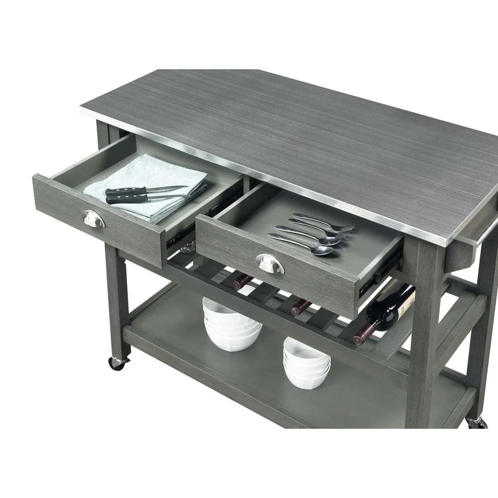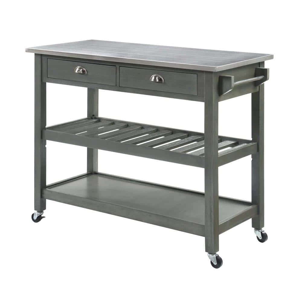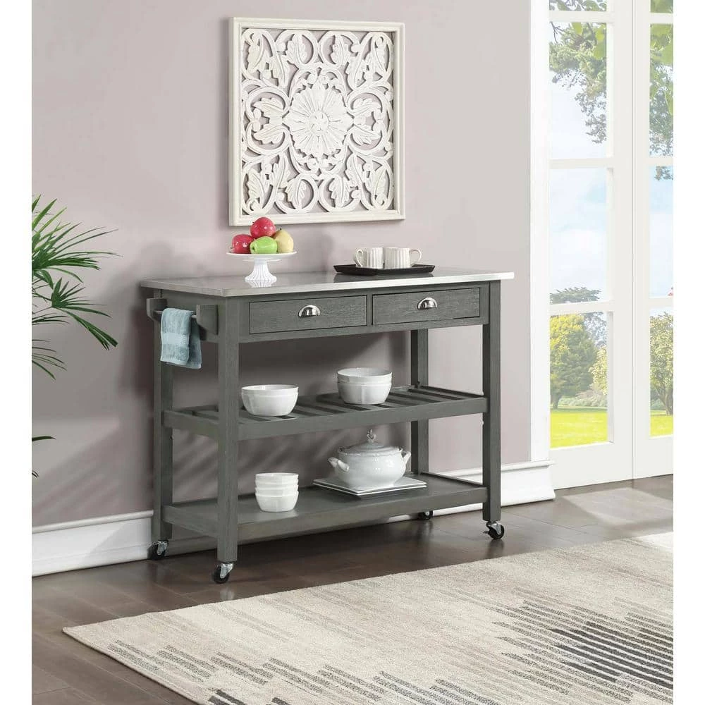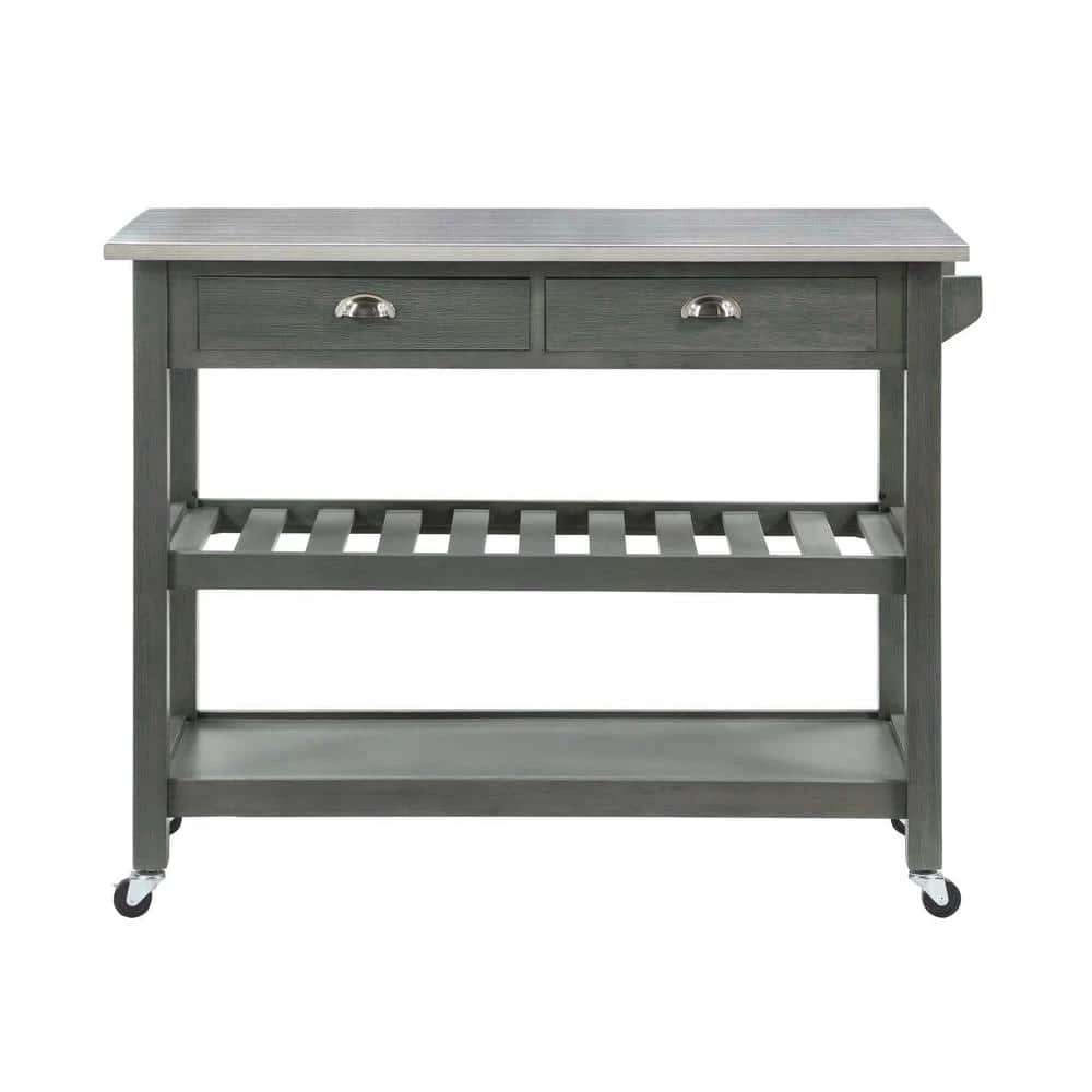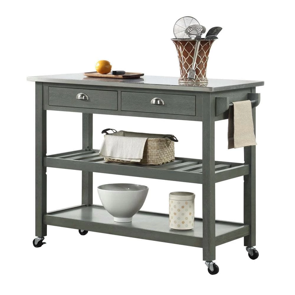 The American Heritage Stainless Steel Top Kitchen Cart by Convenience Concepts combines style and smarts all in one. The smooth stainless-steel top is ideal for efficient food prep and allows for easy cleaning. 2-additional shelves; 2-spacious drawers; and a stainless-steel towel rack offer all the storage one might need. The 360° swivel capabilities of the heavy-duty locking caster wheels make this the perfect mobile storage space. This-piece is perfect for small kitchens; apartments; and anywhere you need a little extra storage or kitchen prep space. Choose the one that best compliments existing interiors with multiple finishes to pick from. Add this eye-catching American Heritage Stainless Steel Top Kitchen Cart from Convenience Concepts to keep your space effortlessly organized.