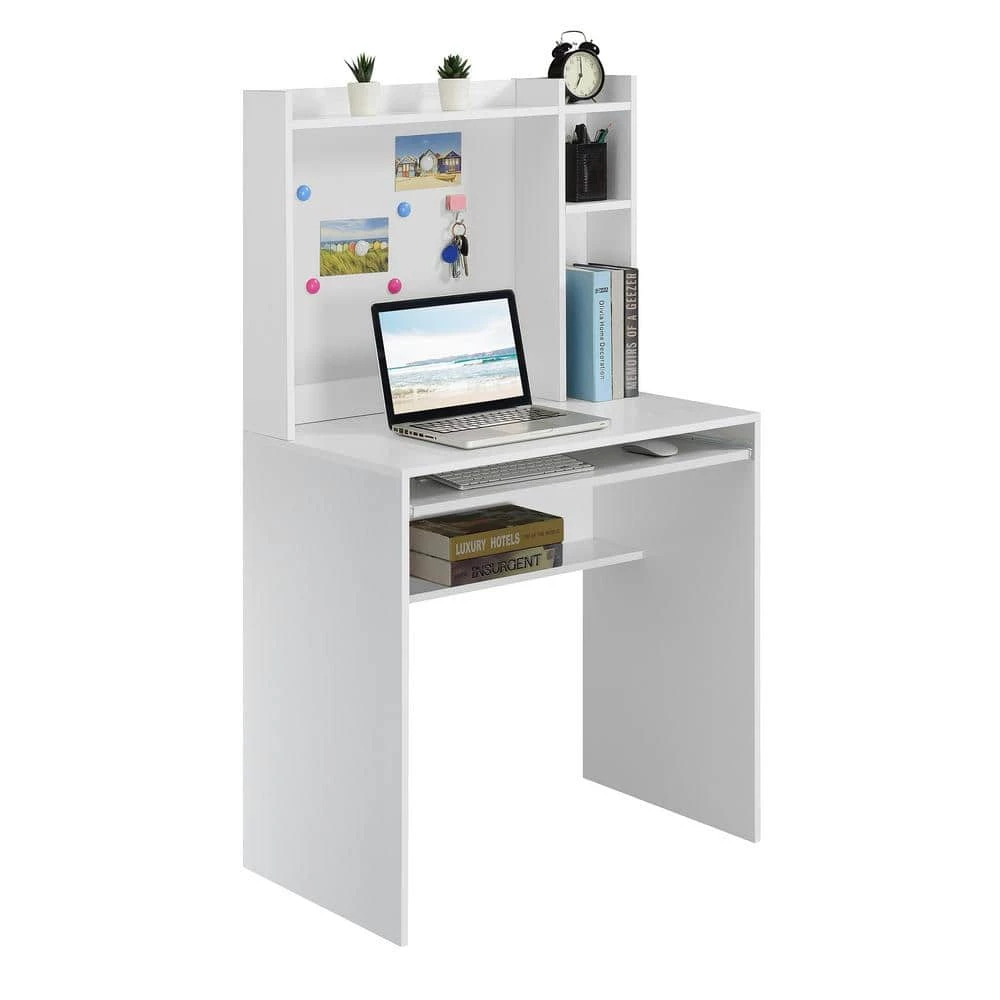 Get organized with the Designs2Go Student Desk with Magnetic Bulletin Board and Shelves by Convenience Concepts. This desk is essential for any student or one working from home. This unit comes equipped with 6 round magnets and 1 hook magnet to keep notes and reminders in clear view on the large magnetic bulletin board. This desk also features a pull-out keyboard tray on roller slides allowing for easy access to a keyboard and mouse. Several tiers of shelving offer plenty of space for basic school or office supplies. This functional unit is constructed with particleboard and melamine veneer, giving this desk a beautiful woodgrain appearance. Upgrade your workspace with additional pieces from the Designs2Go Collection from Convenience Concepts, each sold separately.