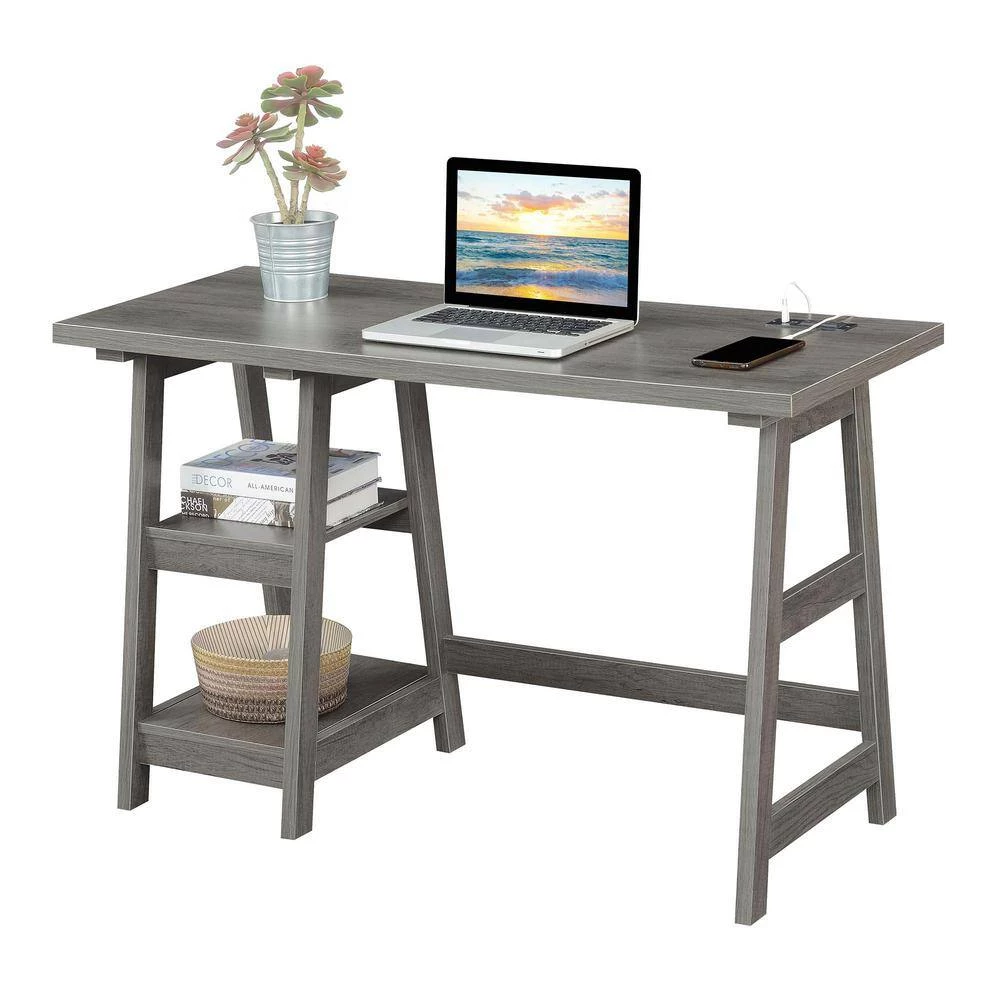 Improve your workspace with The Designs2Go Trestle Desk with Charging Station by Convenience Concepts. This contemporary design has no age limits and combines simplicity and functionality all in one. Thanks to the large surface top; there is ample space for a student who is studying or for those working from home. The charging station conveniently located on the desktop includes two standard outlets and two USB ports which can charge a phone; tablet; laptop and more. In addition; the power supply cord is 6 feet in length giving this desk the flexibility needed when it comes to placement. The left side of this piece feature two sturdy shelves giving extra space to store schoolwork or office essentials. Built to last; this unit was crafted from Particleboard and MDF. The Designs2Go Trestle Desk with Charging Station is available in a wide variety of bold colors that are sure to match with any current furnishings.