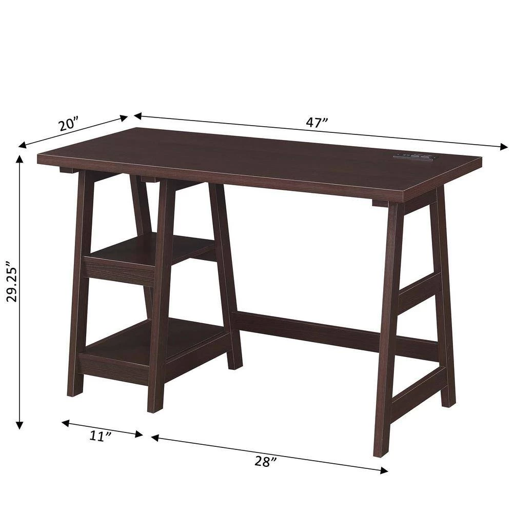 Looking for a place to work or study with a quick and easy set up. The Designs2Go No Tools Student Desk with Charging Station by Convenience Concepts is perfect for you. This stylish desk features plenty of storage space with a unique assembly that requires no tools. The charging station conveniently located on the desktop includes two standard outlets and two USB ports which can charge a phone, tablet, laptop and more. The power supply cord is 6 feet in length giving this desk the flexibility needed when it comes to placement. Supported by stainless steel poles, this desk was built for longevity and durability. Great for an office or dorm, this desk is not only for a student but anyone wanting to add simplicity to their workload.
