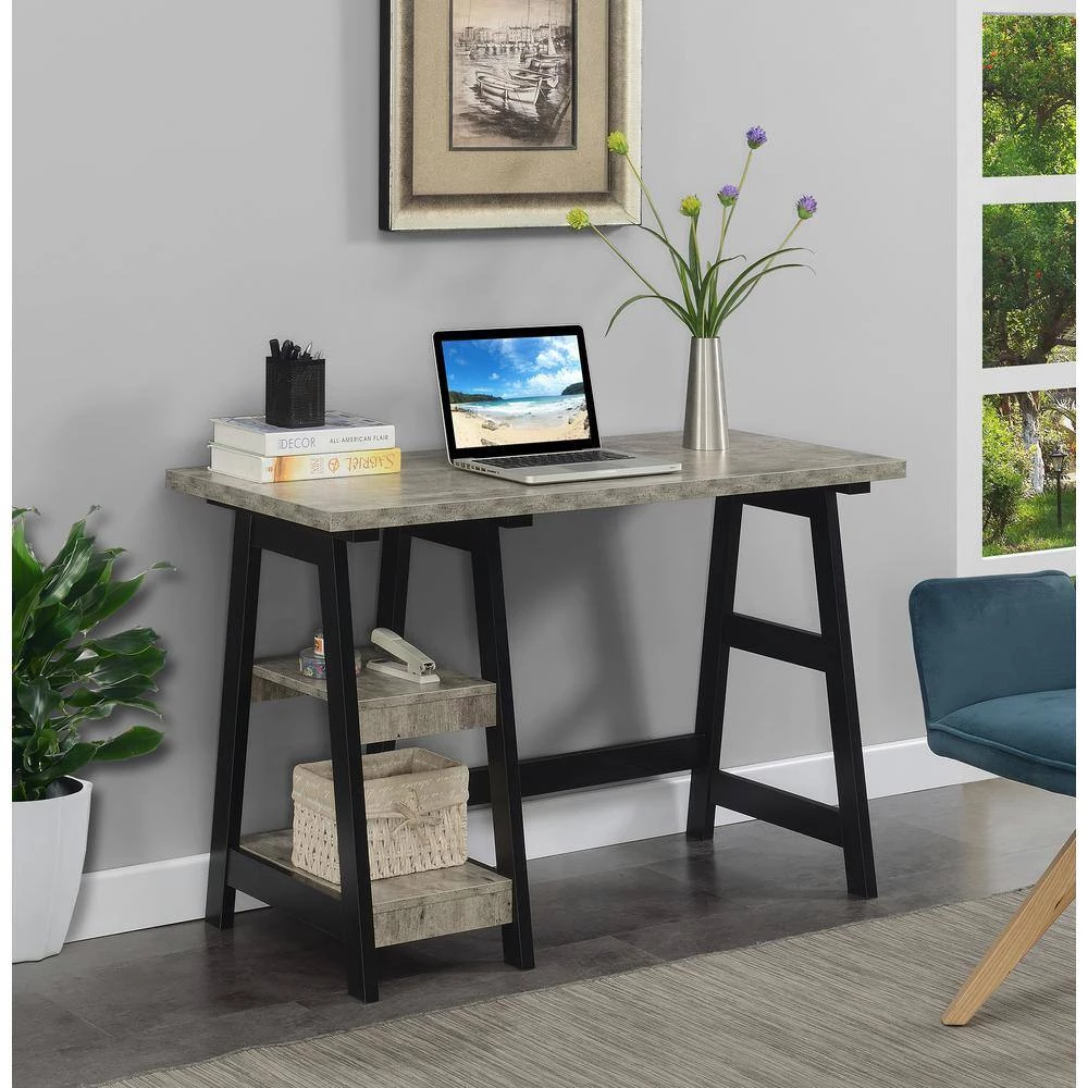 The Designs2Go Trestle Desk by Convenience Concepts has a variety of key features. With 2 fixed shelves that provide plenty of space for the extras – such as files, books, or even supplies. The perfectly sized desk top has ample space for computer, keyboard and mouse. The sleek contemporary design is just an eye pleasing plus.