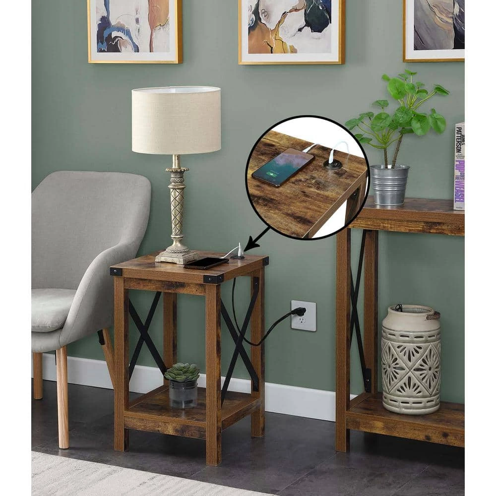 Add functionality to your industrial styled home with the Durango End Table with Charging Station by Convenience Concepts. Featuring a built-in charging station on the tabletop surface for easy accessibility. The charging station includes2-USB ports which can easily charge your phone or tablet. The versatility of the exposed built-in station allows for multiple devices to sit on the tabletop without the damaging or twisting of cords. The power supply cord is 6 feet in length giving you the room you need to display your end table where you choose. Includes a bottom shelf great for books; display; or additional storage. Engineered from particleboard and powder-coated metal; this piece is built to last. Pair with more beautiful items from the Durango Collection by Convenience Concepts; each sold separately.