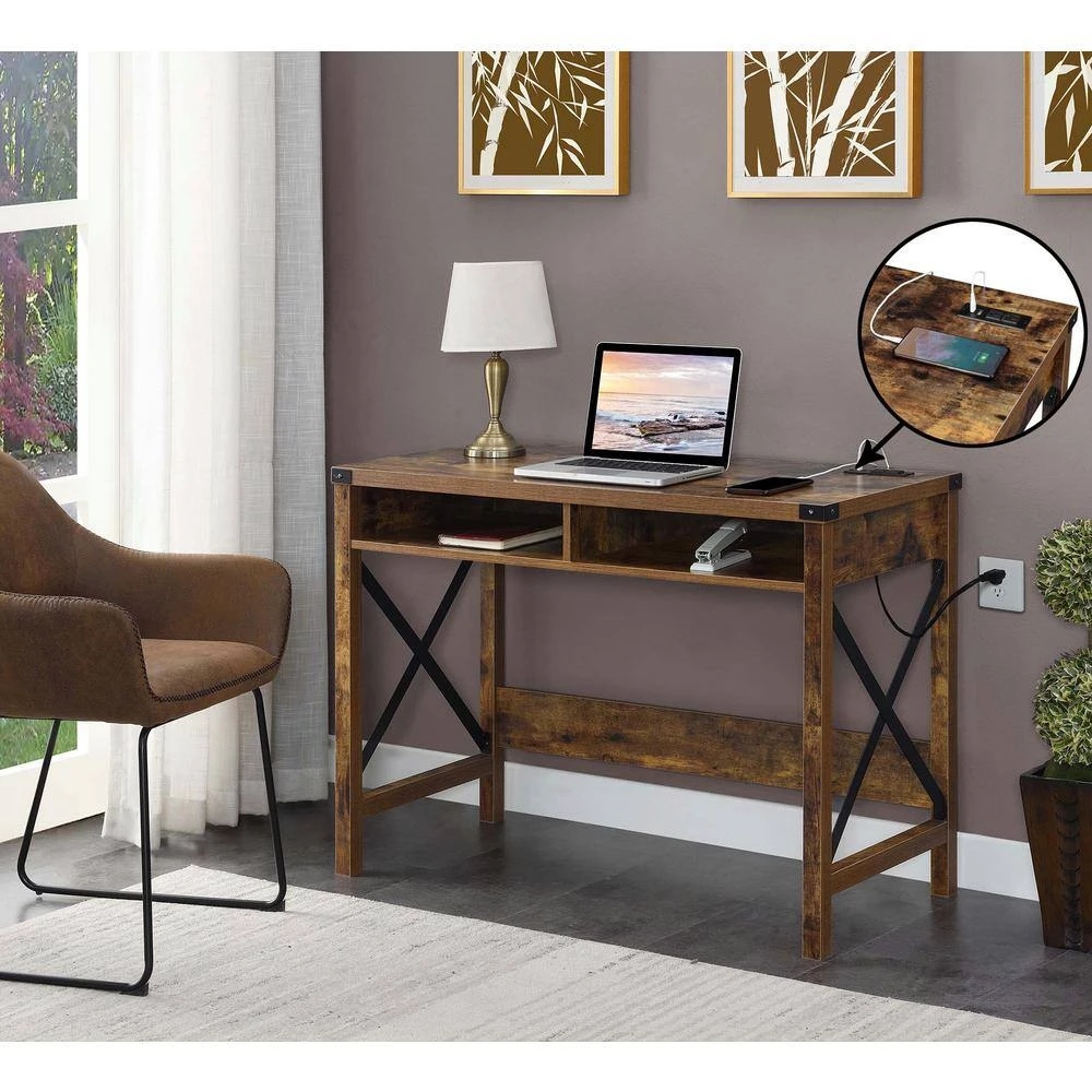 Add functionality to your industrial styled home with the Durango 42 in. Desk with Charging Station by Convenience Concepts. Featuring a built-in charging station on the tabletop surface for convenience and easy accessibility. The charging station includes 2-USB ports and 2-standard outlet plugs which can easily charge your phone; tablet; or laptop. The versatility of the exposed built-in station allows for multiple devices to sit on the tabletop without the damaging or twisting of cords. The power supply cord is 6 ft. in length giving you the room you need to display your end table where you choose. Engineered from particleboard and powder-coated metal; this piece is built for long-term durability. Pair with more beautiful items from the Durango Collection by Convenience Concepts; each sold separately.