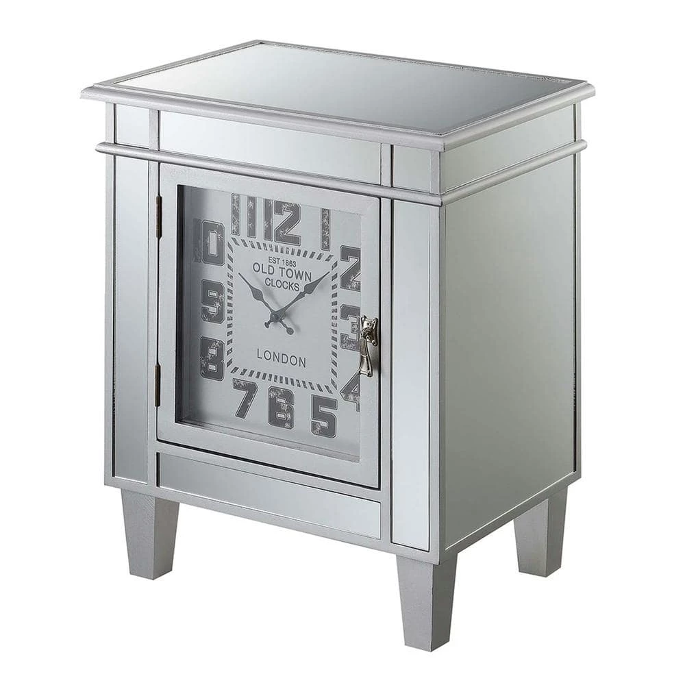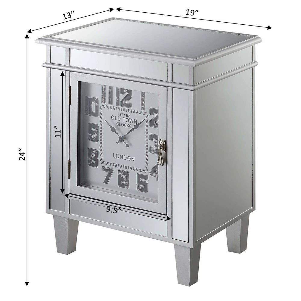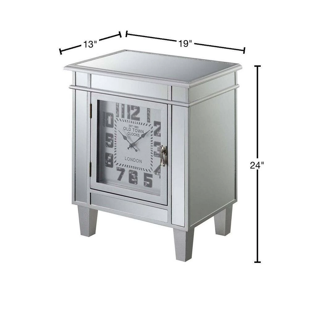 Steer clear of basic decor with the Gold Coast Clock End Table with Storage Cabinet by Convenience Concepts. You get two for one, as this piece serves as both a side table and a working clock. Avoid the hassle of taking down your wall clock, readjusting its time, and hanging it back in place. With this clock table, you will have the convenience of adjusting the time within reach. Subtly optimizes storage and display space with its cabinet hidden behind the clock. Just pull on the small handle and place your books or entertainment essentials. Replete with mirrors, this multifunctional unit will create visual space in your living room, home study or den. Showcasing a modern contemporary flair, it will keep your home decor in vogue. Constructed from MDF, this accent furniture will beat the test of time. It is finished with mirrors and non lead based paint that helps this conversation starter be easy maintenance. Enjoy right after delivery by adjusting the clock and inserting a one AAA battery. Battery not included. Pair this distinctive clock with additional items from the Gold Coast Collection by Convenience Concepts. Each sold separately.