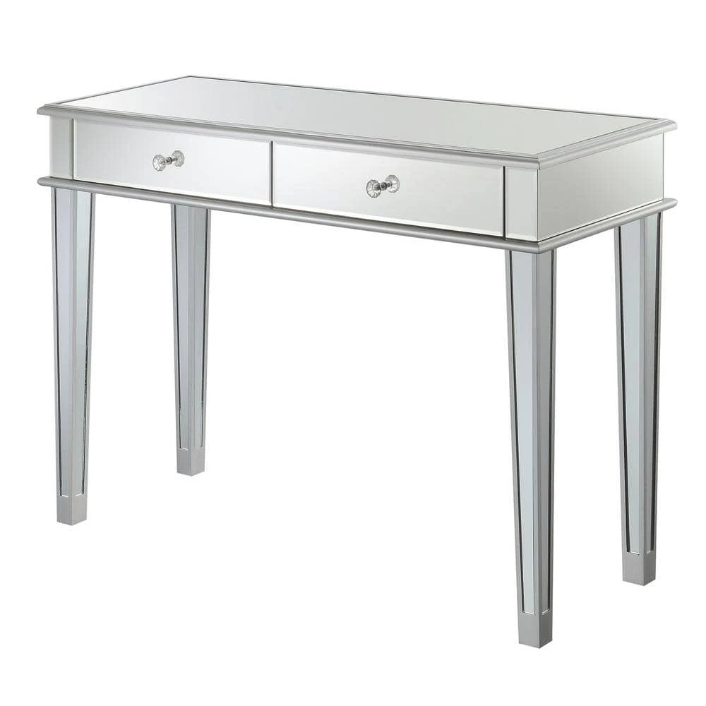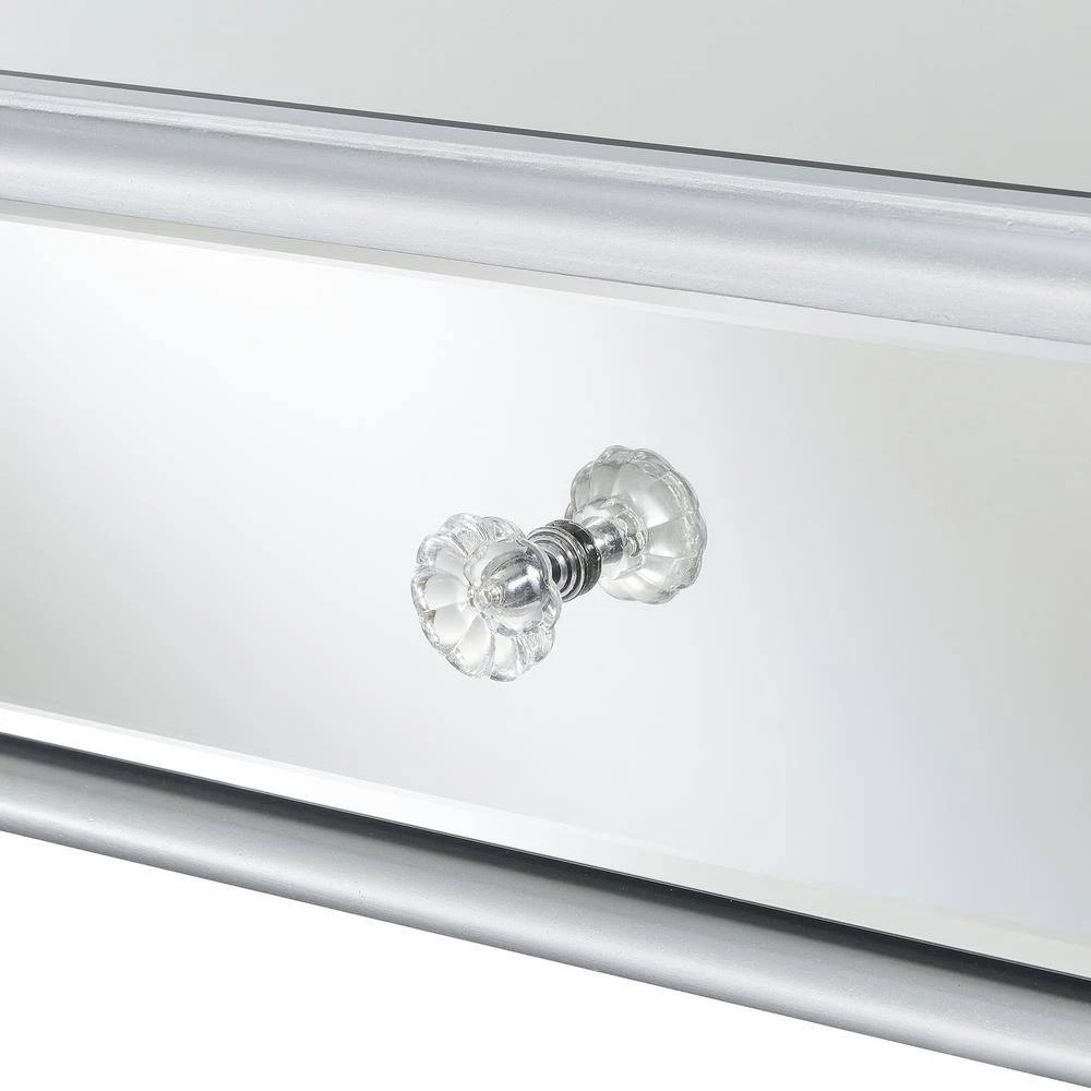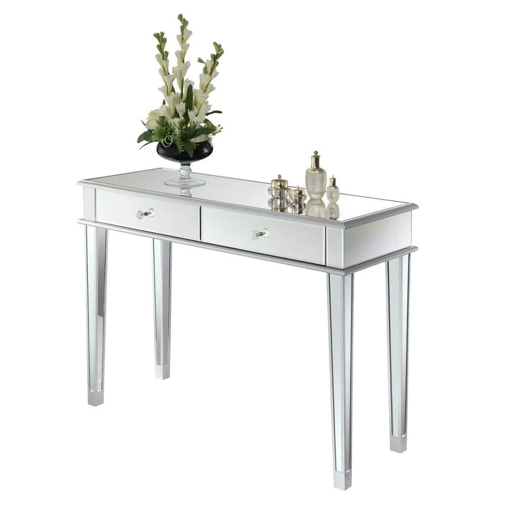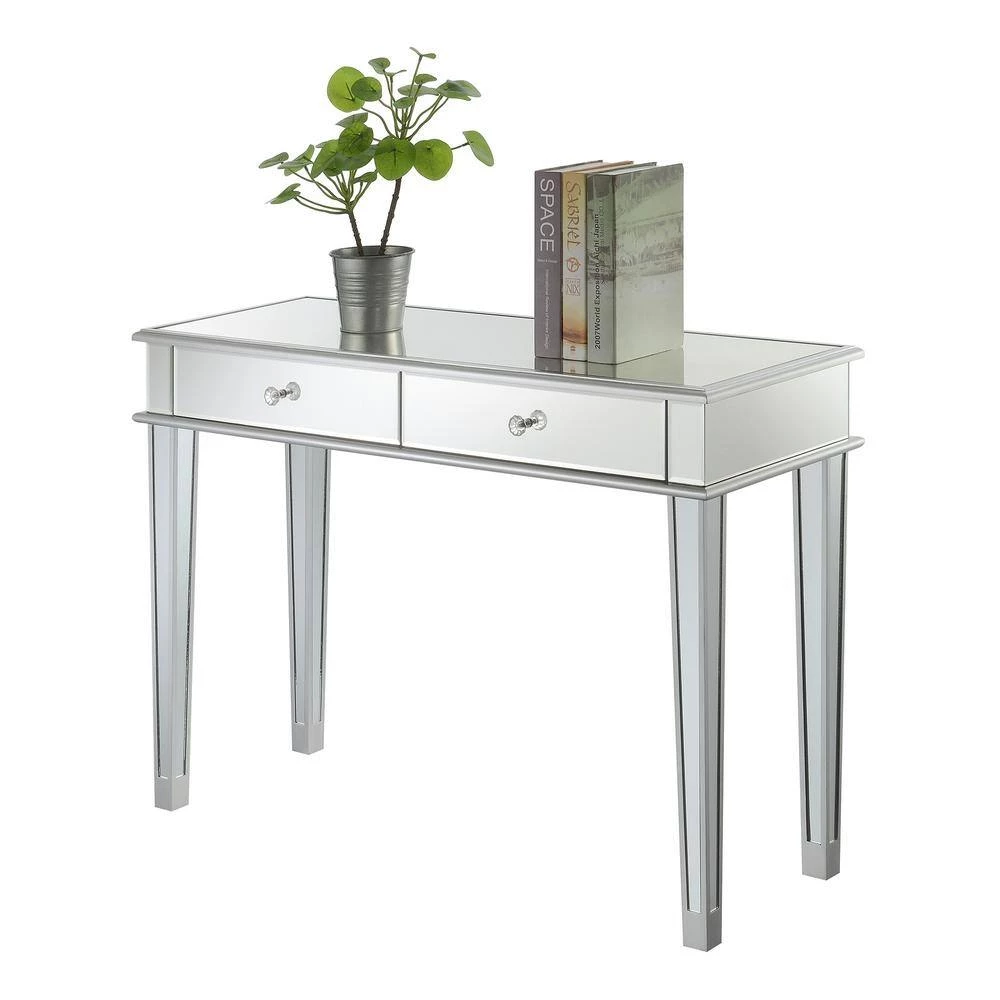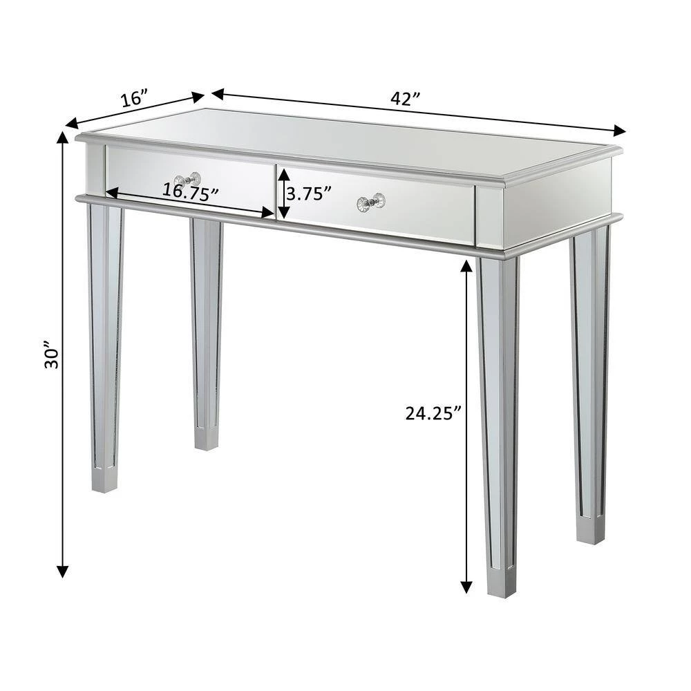 Glam up your home furnishings with the Gold Coast Deluxe 2 Drawer Mirrored Desk/Console Table by Convenience Concepts. This chic and sleek desk will bring any room to life with its luxurious glass mirrored panels. Two spacious pull-out drawers on roller slides reveal plenty of room for concealed storage. Stylish crystal faux drawer knobs offer easy accessibility to your home essentials. Constructed from MDF and glass mirrors, this desk is built to last. Beautiful silver non-lead-based paint surrounds the mirrored frame which gives this carefully crafted unit just the right amount of sparkle. This piece offers much versatility and can be utilized as a desk, console table, or vanity. Add additional glam throughout your home from the Gold Coast Collection by Convenience Concepts, each sold separately.
