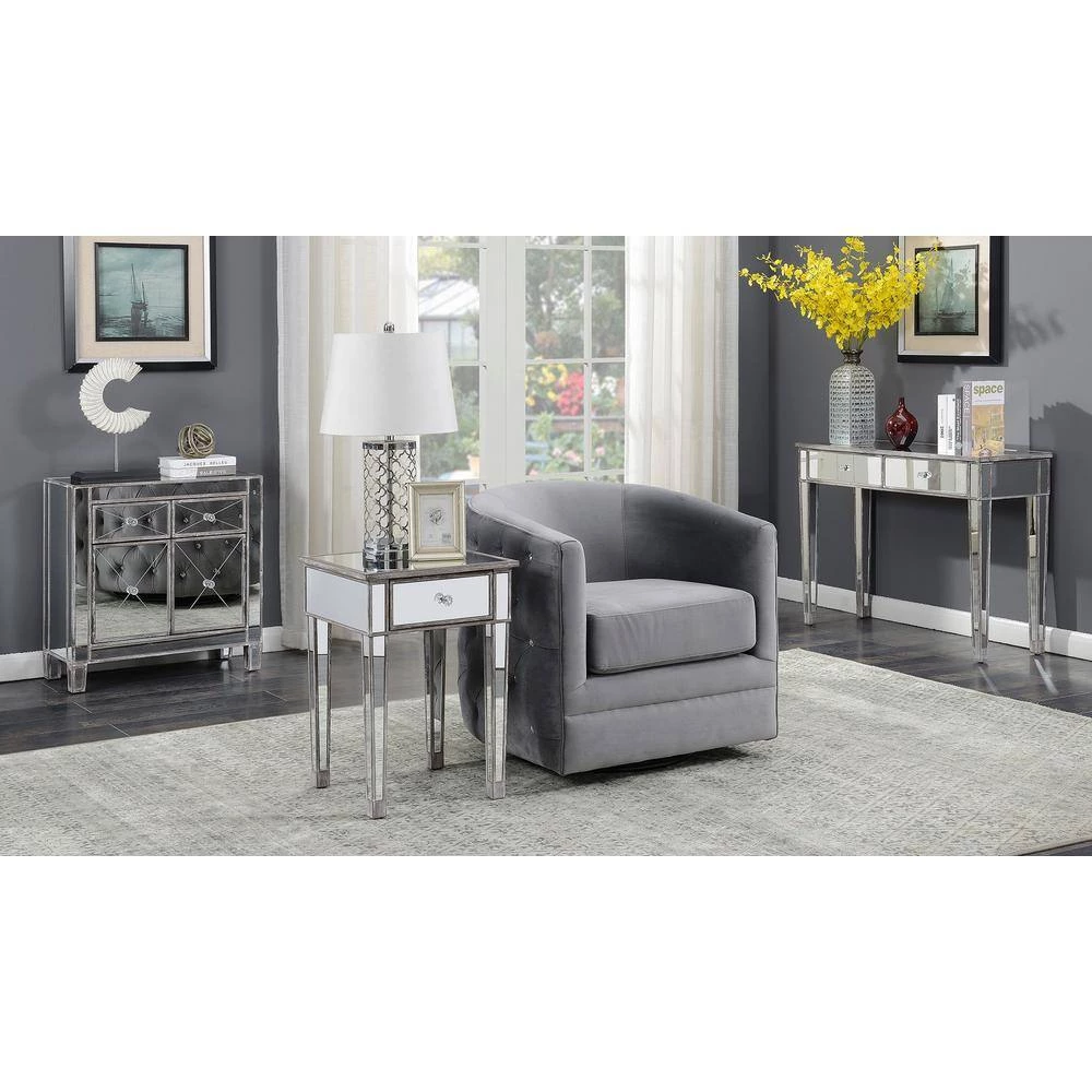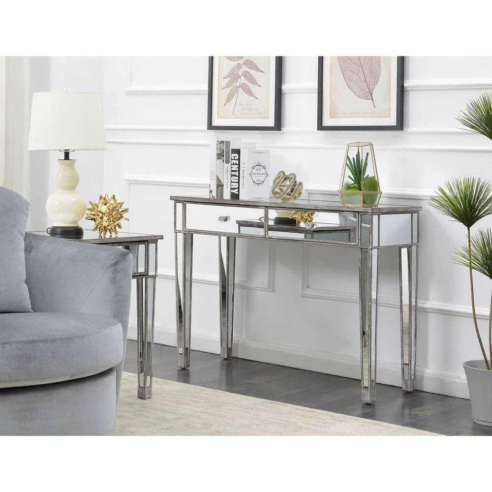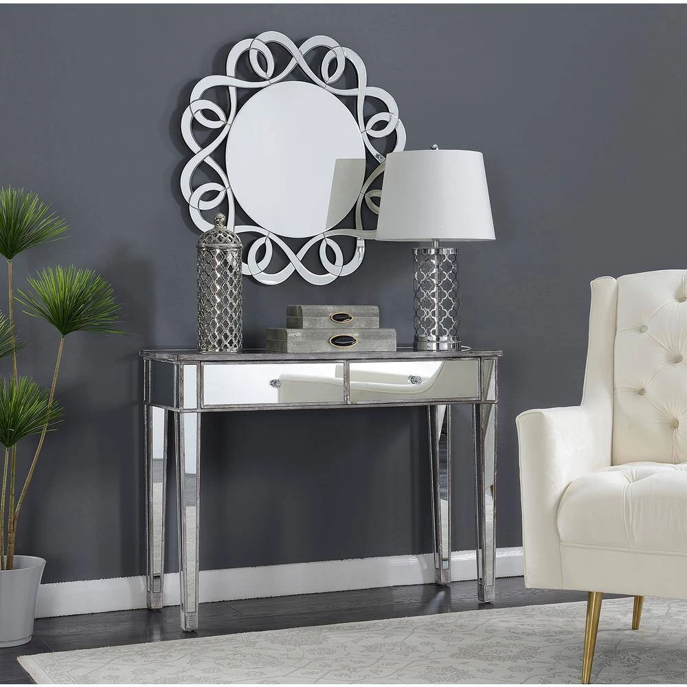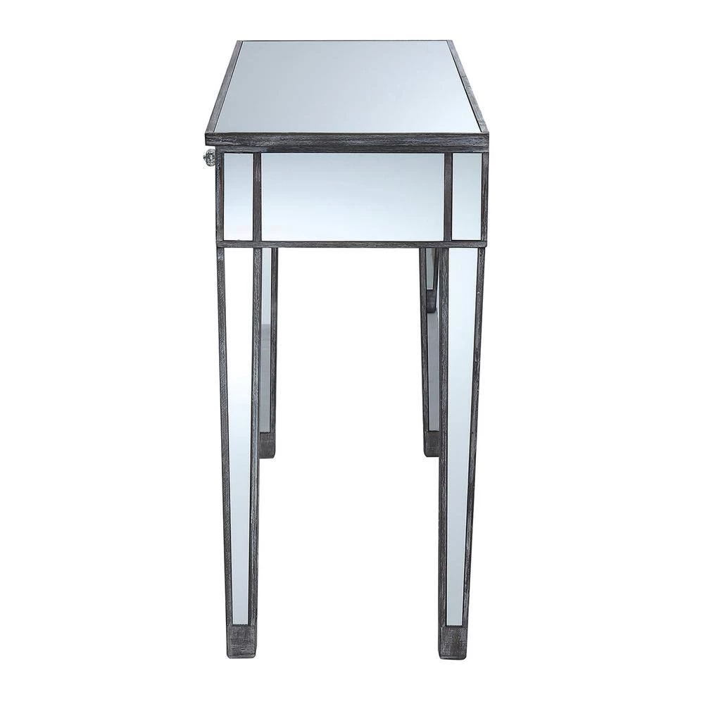 The classy yet contemporary styling of the Gold Coast Mirrored Desk will bring life to any space. The glass mirror inlay pairs perfectly with everything. The faux crystal drawer pulls bring the look together giving you access to the 2-drawers providing concealed storage. Look for other pieces from the Gold Coast Collection sold separately.