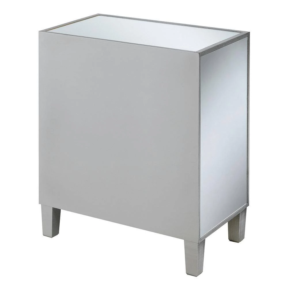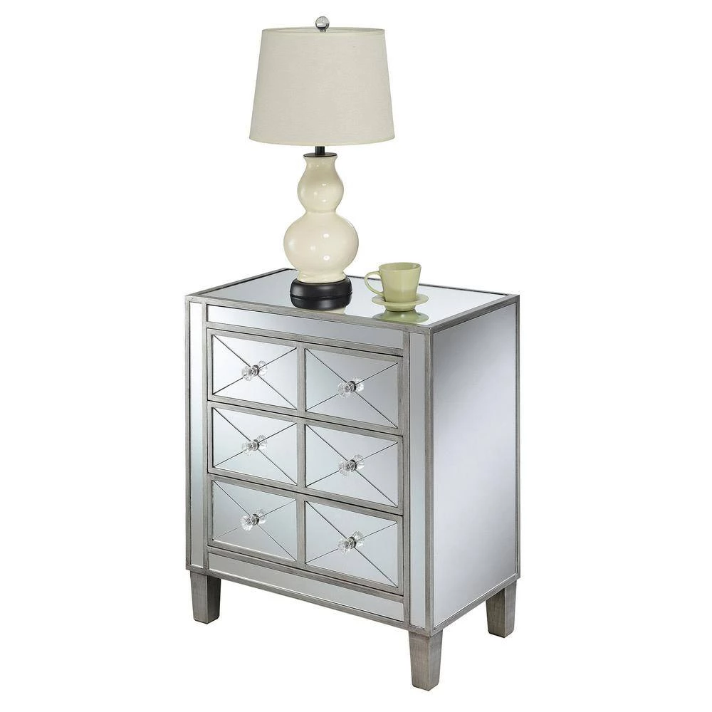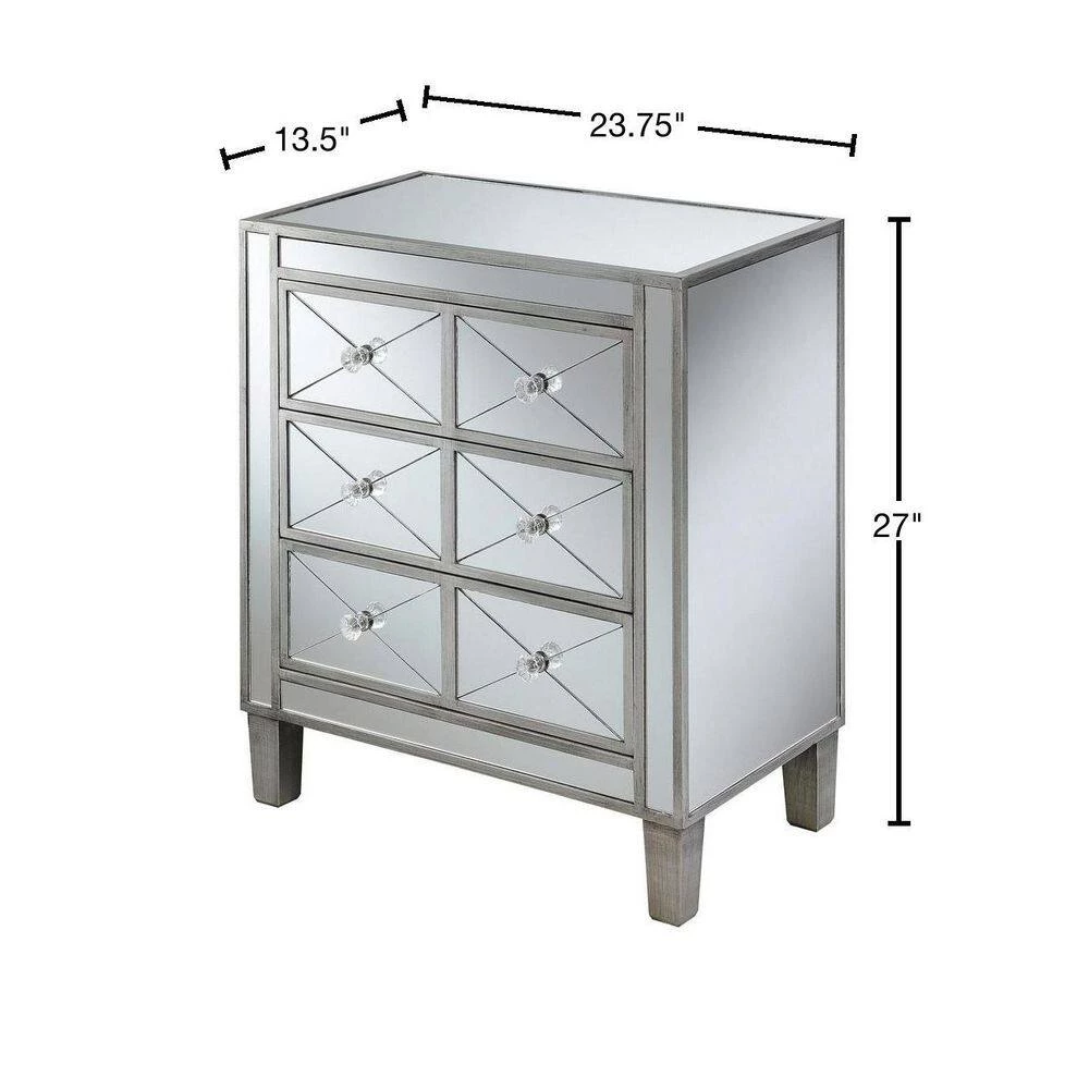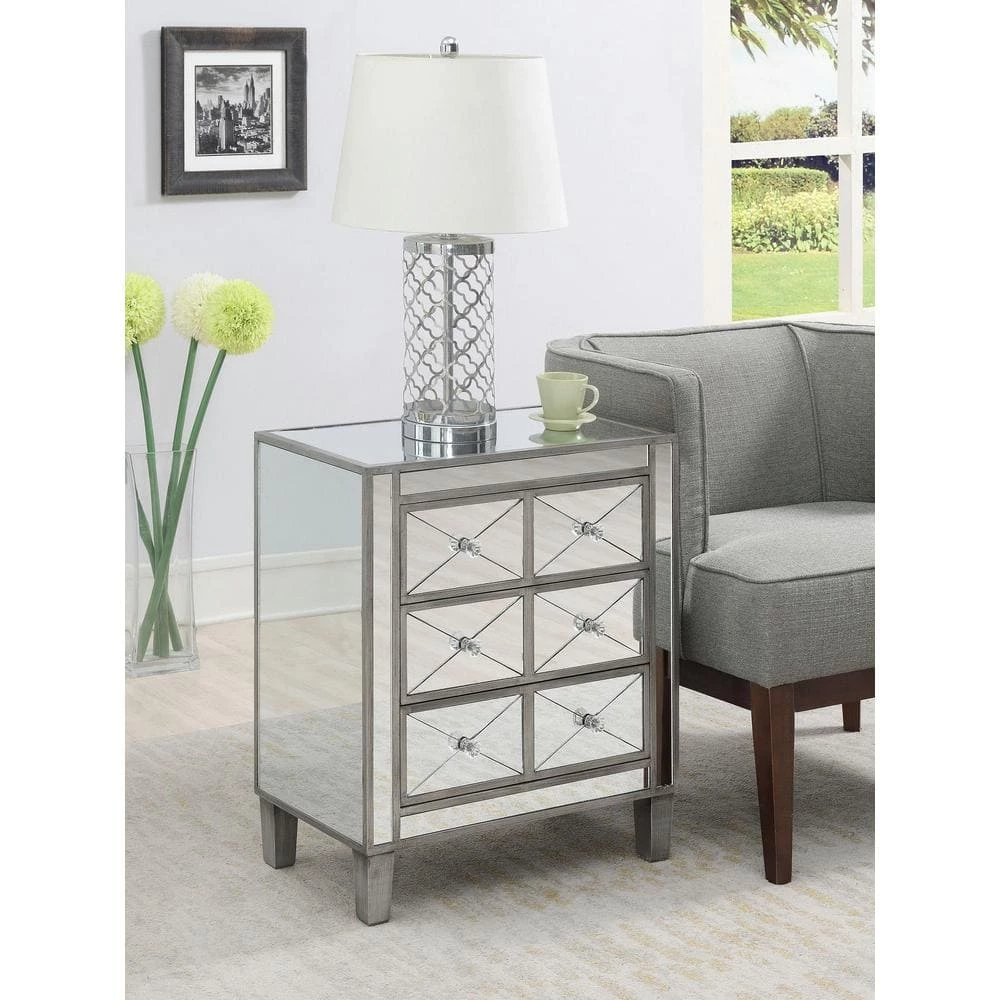 Add glamour to your home decor with the Gold Coast BettyB 3-Drawer Mirrored End Table from Convenience Concepts. Features a glam style to update your ensemble. Created from MDF and decked out with mirrors; this side table is a must have piece. Its tapered feet are made of solid fir wood and finished with non lead based paint. Features a clean lined silhouette with 3 pull out drawers; each adorned with engraved X detailing and two faux crystal rosette knobs to optimizes storage space. This storage cabinet provides an elegant mirrored finished table top for your display needs. This multifunctional table is perfect for your entryway; living room or home study. It is beautiful; chic and easy to assemble. Enjoy in no time with its easy 1 step assembly. Look for additional furniture pieces from the Gold Coast Collection from Convenience Concepts and add more shimmer to your home today.