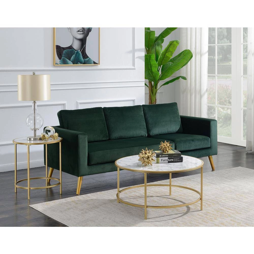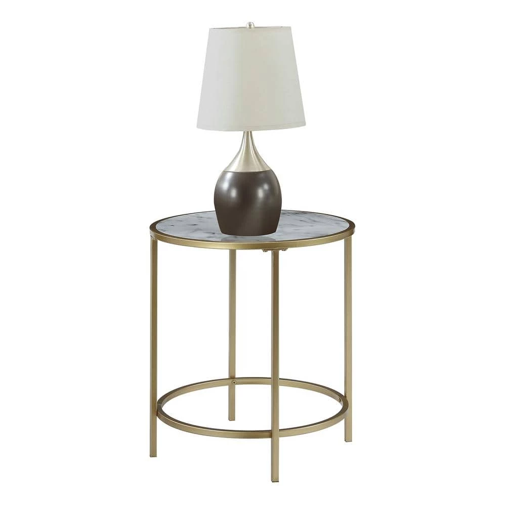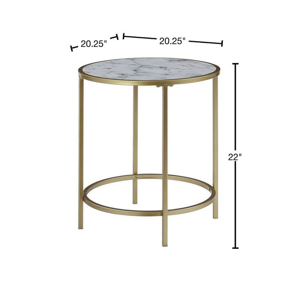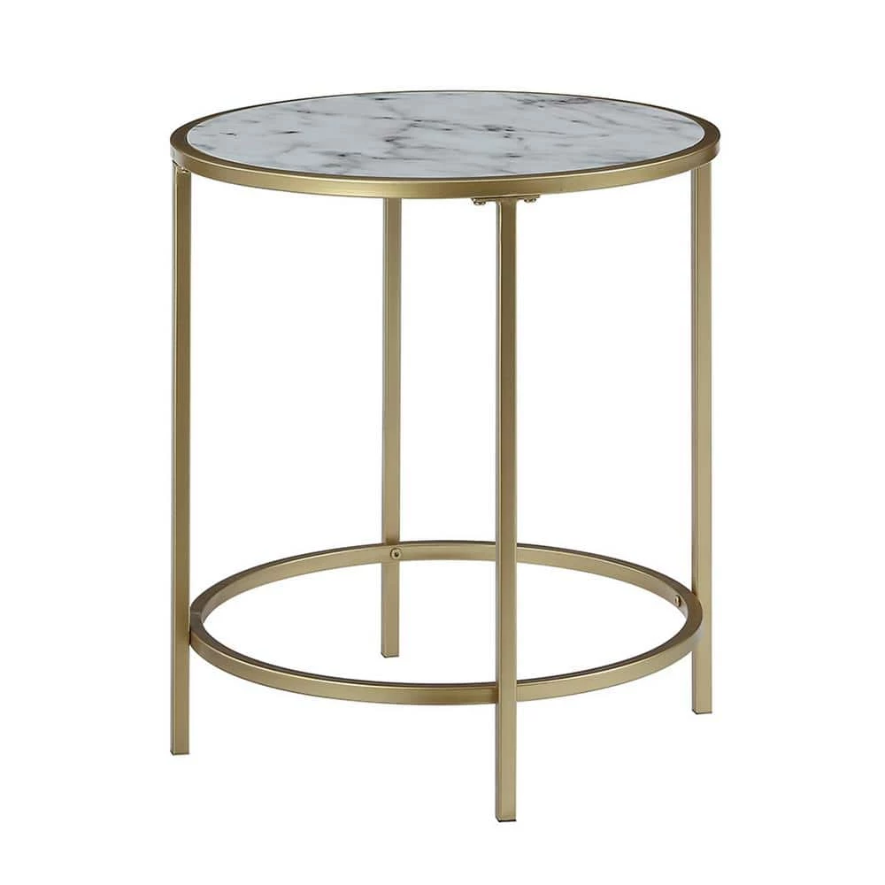 Add luxury to your home with the Gold Coast Faux Marble Round End Table from Convenience Concepts. Featuring a contemporary style with glamorous finishes, this end table will upgrade your decor and charm its way into becoming a staple in your home. Its clean-lined silhouette and ample table top ensure the perfect display space for your favorite collectibles. The base is crafted from gold powder coated metal and table top is made of MDF and finished with a beautiful glossy white faux marble with gray veining, this table will beat the test of time while ensuring easy maintenance. With its simplistic design the Gold Coast Faux Marble Table can fit seamlessly into your living room as an end table or add some glam to your bedroom as a nightstand. Enjoy right after delivery with its quick and easy assembly in only 2 steps. Look for additional pieces from the Gold Coast Collection from Convenience Concepts, each sold separately.