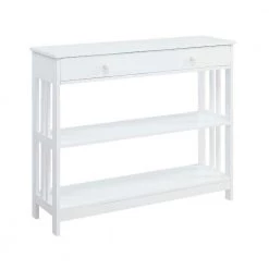 Instantly optimize your storage and display space by bringing home the Mission 1-Drawer Console Table with Shelves by Convenience Concepts. Offers three ample shelves, enough for all your beloved mementos and 1-Drawer for those unsightly essentials. The drawer is accompanied by roller style metal drawer slides, to help you open and close the drawer smoothly. Do not forget about the signature style side frames, they give this piece its sleek look and contemporary style. Crafted from MDF and finished in a non lead based paint, this accent unit was built for durability. Add to your entryway, hall or living room and enjoy its endless versatility. Allow this furniture to become a staple in your home right after delivery with its simple 9 step assembly. This multifunctional table is available in multiple finishes. Pair with more items from the Mission Collection by Convenience Concepts. Each sold separately.