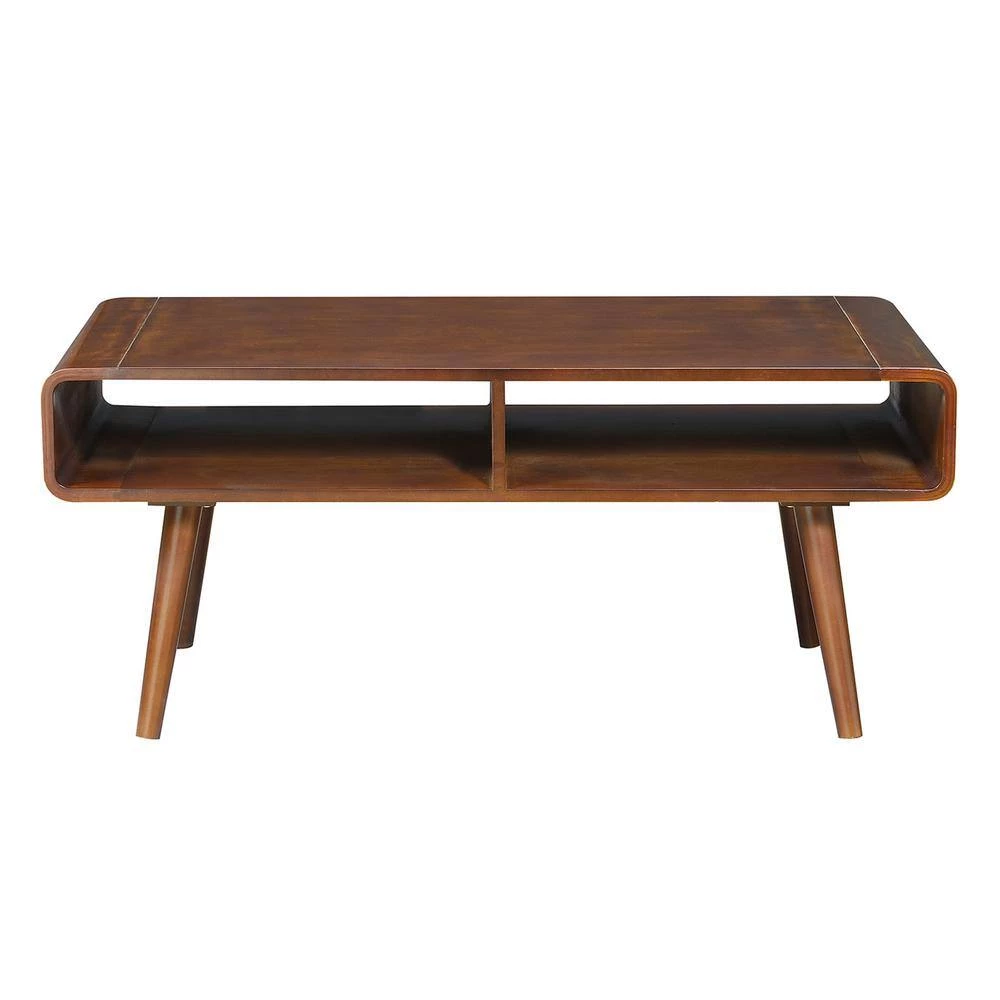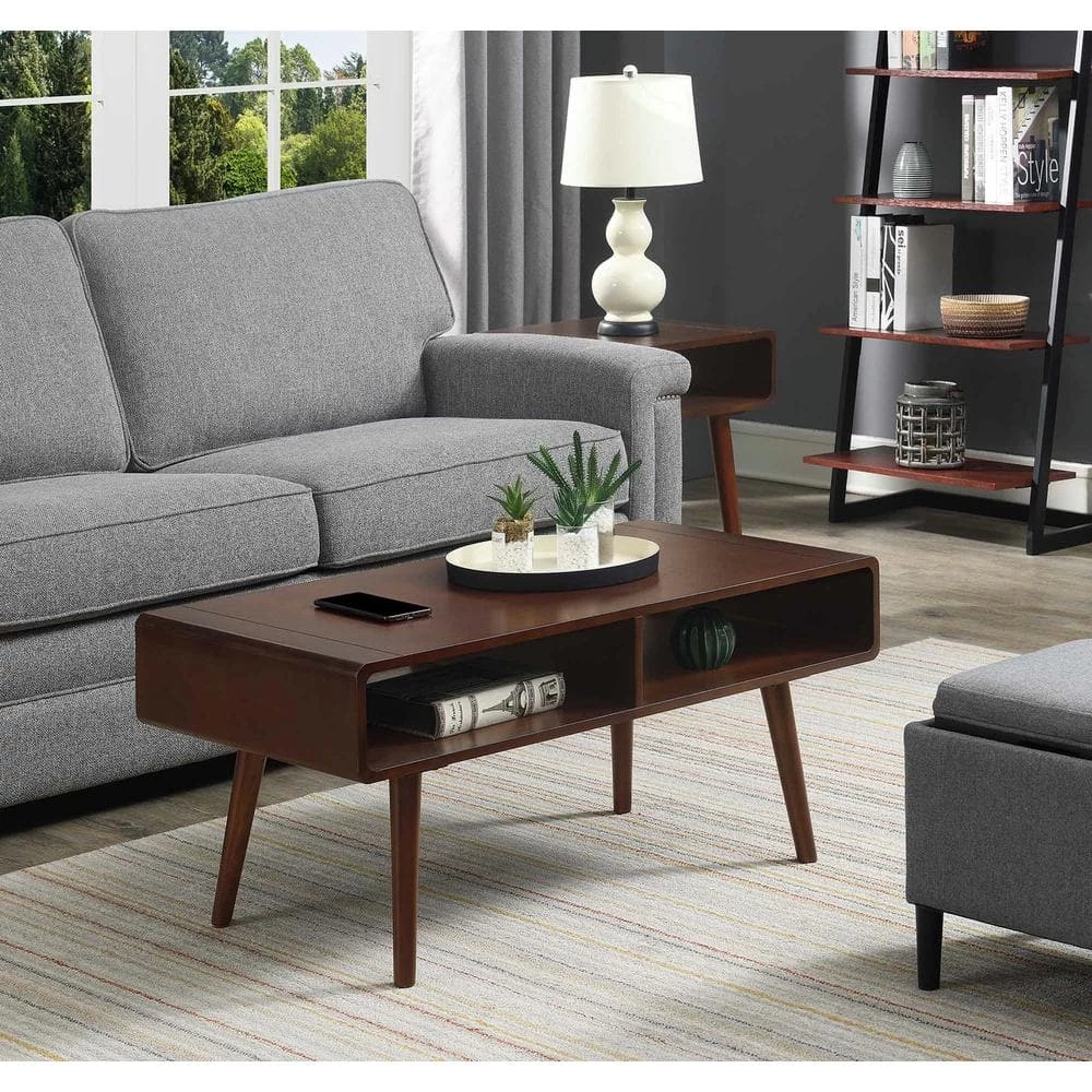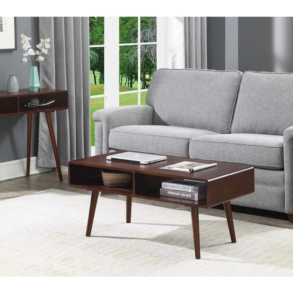 Refresh your home with the Napa Valley Coffee Table from Convenience Concepts. With a minimalist design and Mid-Century modern style combined, this table optimizes storage space for all your living room essentials without overwhelming your current decor. Its curved silhouette, long tapered legs, open cubbies and ample table top, brings an attractive and soothing feel to any room. This table will also endure the test of time with its strong poplar solid wood legs, MDF shelves, and birch veneer. Enjoy within minutes of delivery with its easy assembly of only 1 easy step. Look for matching pieces from the Napa Valley Collection from Convenience Concepts, each sold separately.