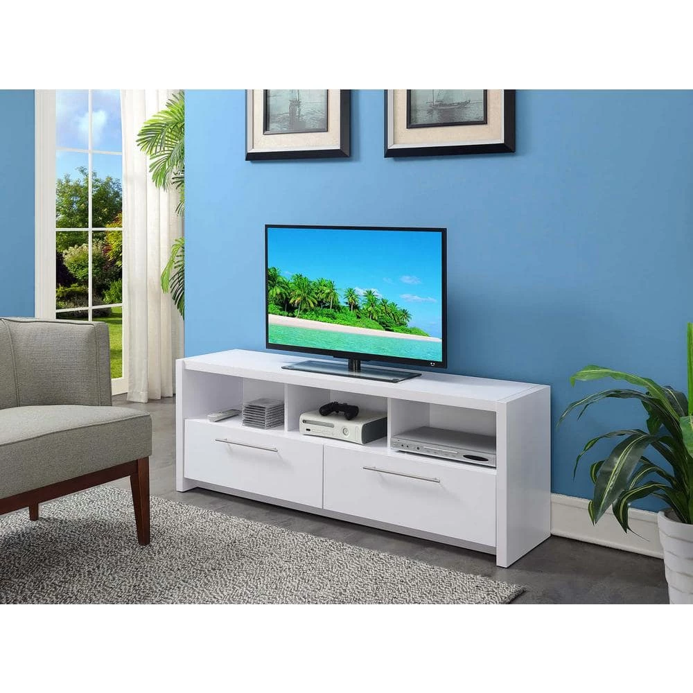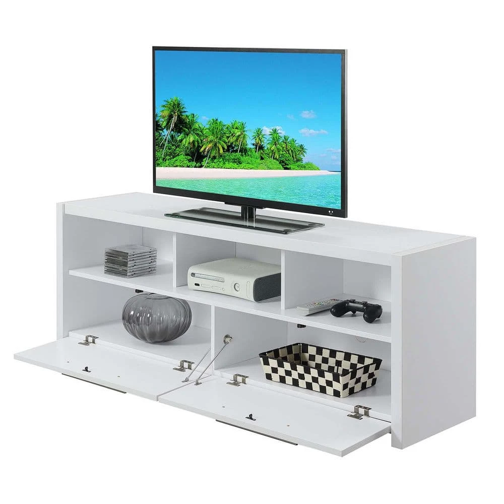 The Newport Marbella TV Stand by Convenience Concepts meets the modern and media filled household. Featuring three open storage compartments, each with their own cable management holes that allows for easy organization. Also featuring two drop down cabinets offering plenty of concealed storage space. The beautiful woodgrain black finish easily fits with any decor.