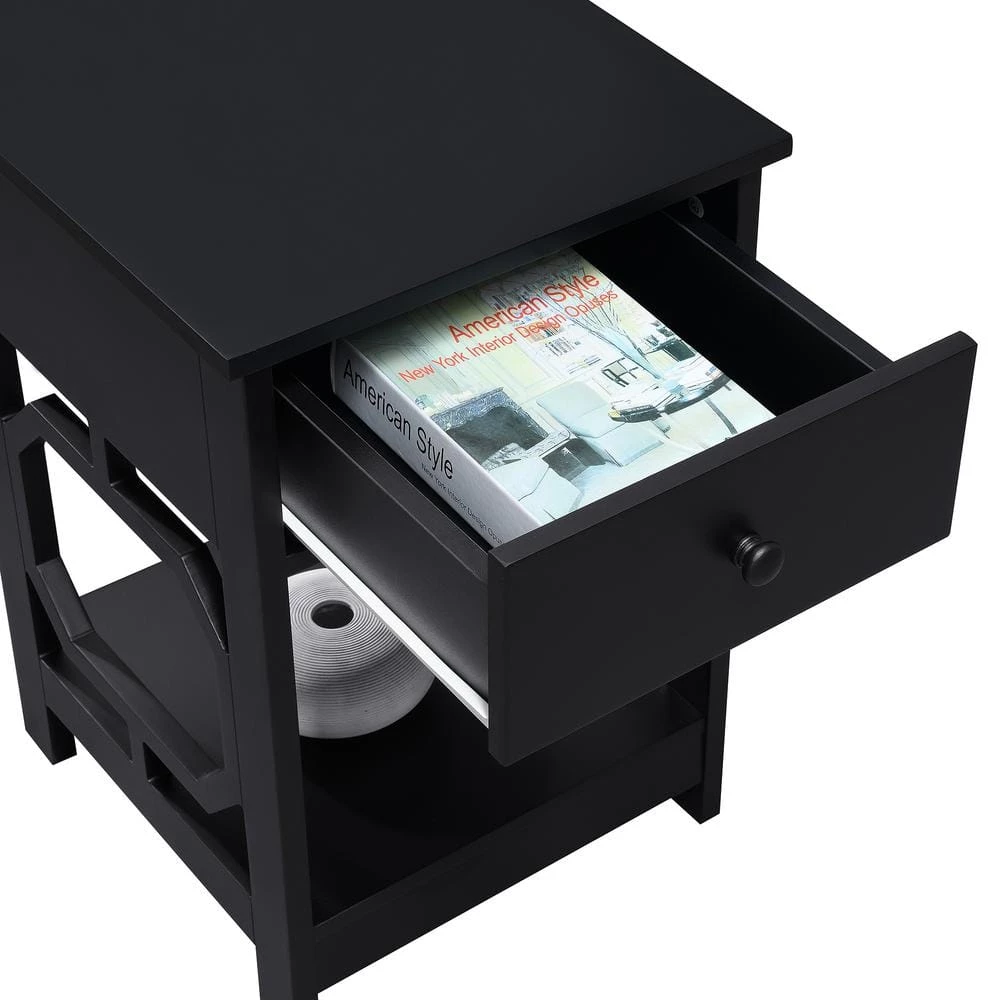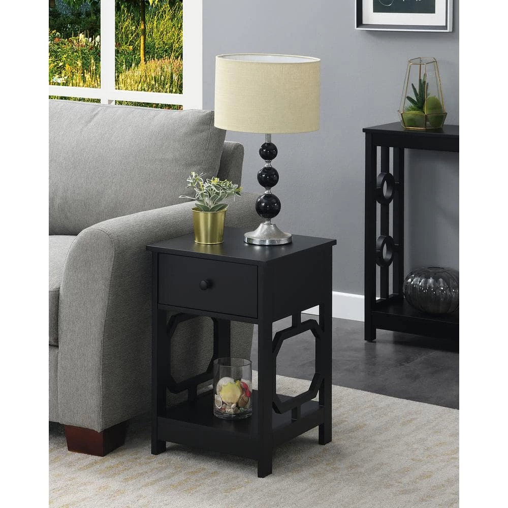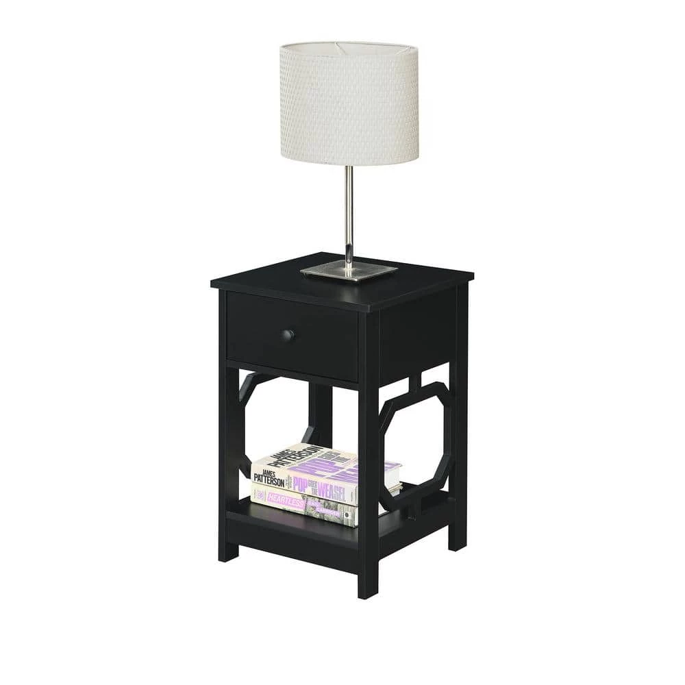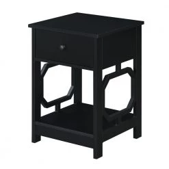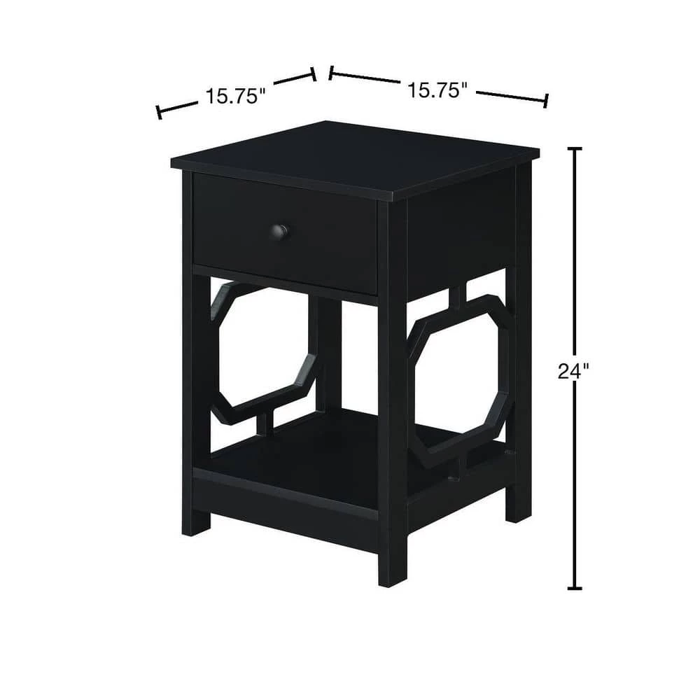 Bring style to your favorite living space by adding the Omega 1 Drawer End Table with Shelf by Convenience Concepts. Its versatile design will ensure you have everything you need within reach. Showcasing a contemporary style, this table boasts a unique octagon side design. In addition to the 2-tiers of shelving, this table also features a pull out drawer to stow away entertainment essentials. Constructed of MDF and finished with a non lead based paint, this end table is durable with easy maintenance. Shop the complete Omega Collection by Convenience Concepts, each sold separately.