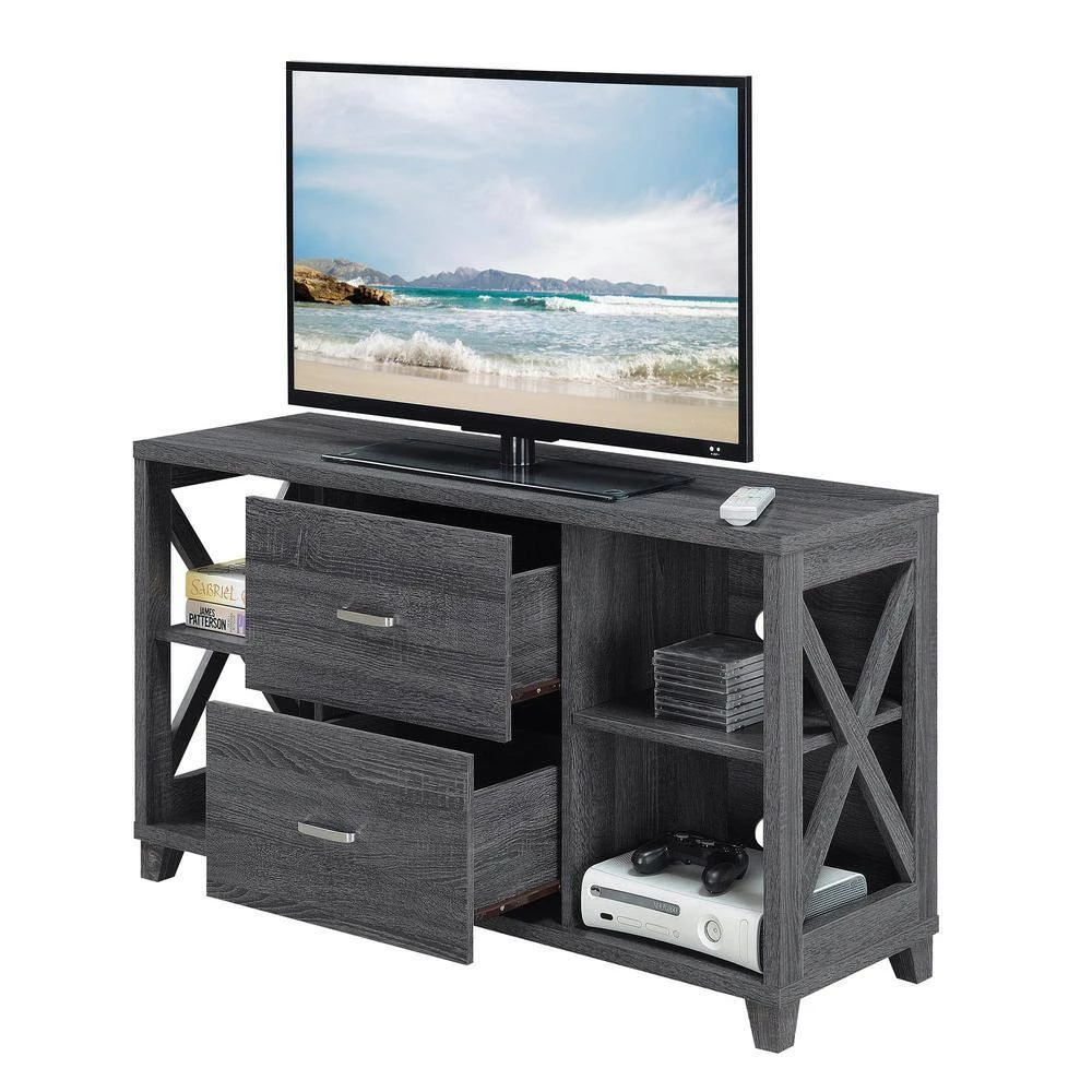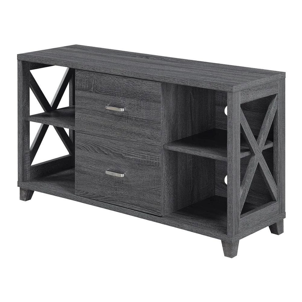 Is your living room in need of a makeover. Look no further and allow the Oxford Deluxe TV Stand by Convenience Concepts to recreate your home decor. With noteworthy X designed side frames this TV stand easily becomes a conversation starter. Offers 2-drawers and 4-shelves the perfect storage and display space combination. The drawers are adorned with metal pulls and have metal glides. With metal glides you can smoothly pull open and close the drawers. Keep your video games movies and remote controls in the drawers while you display your favorite collections or statuettes on the shelves. This TV stand offers a total of 4-circular cable management holes to help you keep cables as easily organized as possible. Showcasing a contemporary style this furniture piece can refresh the decor of your home office or den. Bring home today and stream your favorite TV series in style. Its simple assembly is worth every step. Available in multiple finishes to ensure you find the perfect fit for your home. Pair with an Oxford End Table or an Oxford Coffee Table from the Oxford Collection by Convenience Concepts. Each sold separately.