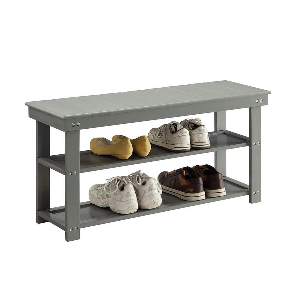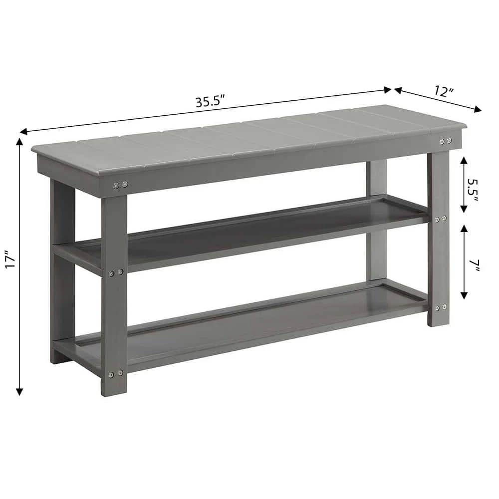 Welcome your guests with the Oxford Utility Mudroom Bench with Shelves by Convenience Concepts. Not only will it spruce up your living space, but it provides a beautiful contemporary style to refresh your own. With comfortable seating and two lower shelves, this entryway furniture is the perfect storage solution you have been searching for. It is perfect to sit and take off your shoes after a long day at work while keeping them close by in the lower section. Not only is this foyer unit crafted from MDF and solid wood, but it is also finished with a beautiful non lead based paint. Place in your living room, entryway, den or home study and enjoy its multifunctional feature. Enjoy right away with its easy 3 step assembly. Available in multiple finishes, this hallway storage bench complements any home decor. Find more furniture pieces from the Oxford Collection by Convenience Concepts. Each sold separately.