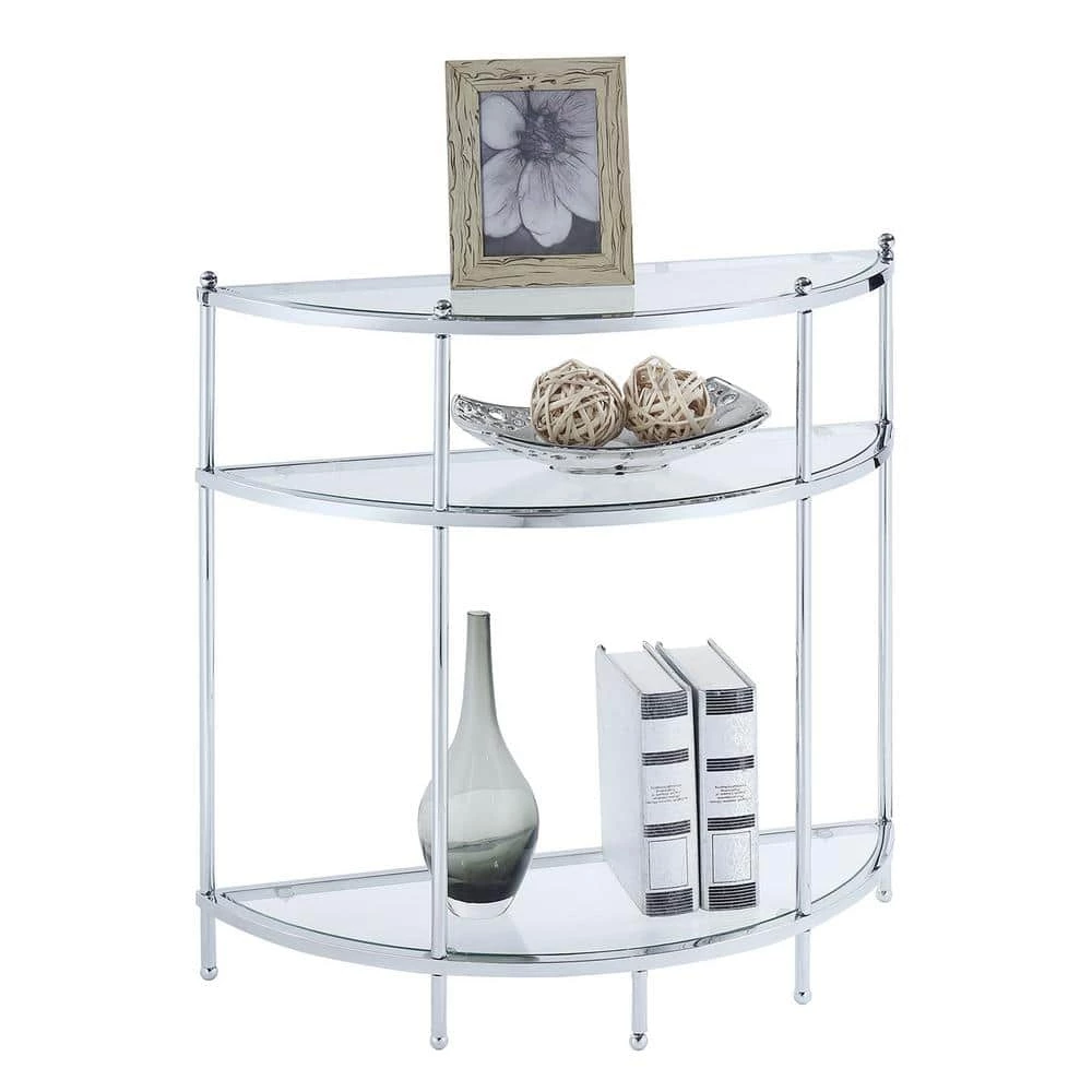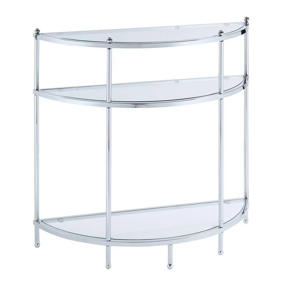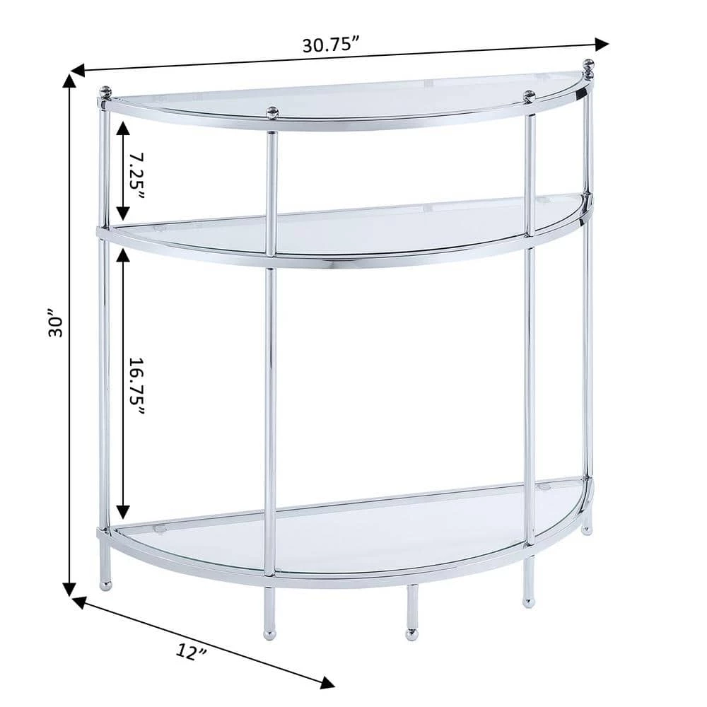 Enhance your living room decor.with the Royal Crest 3-Tier Half-Circle Glass Entryway Table by Convenience Concepts. The Chrome frame provides the durability you need, while giving the contemporary look you want. Also featuring 3 tiers of glass shelves that provide plenty of space to display collectibles or additional storage. Coordinating items available sold separately.