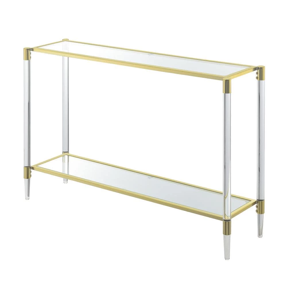 Glam up any space in your home with this luxurious Royal Crest 2-Tier Acrylic Console Table by Convenience Concepts. Two gold chrome frames with two tiers of clear tempered glass shelves are supported by four sleek and sturdy clear acrylic legs. Plenty of space is available to display all your glamourous decorative pieces on this chic console table complete with two tiers of shelving. Coordinate this beautiful piece with more from the Royal Crest Collection by Convenience Concepts, each sold separately.