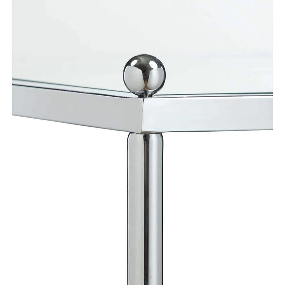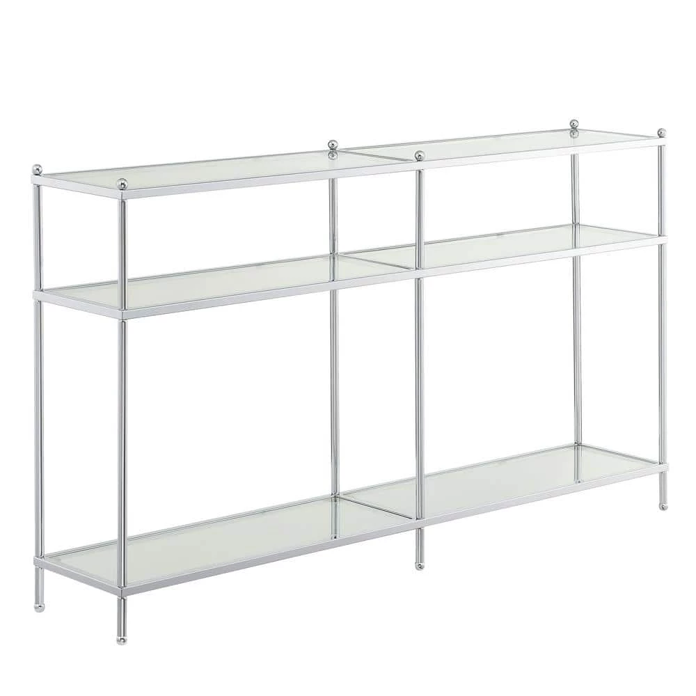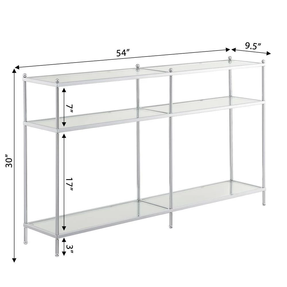 Add some contemporary class to your living room decor.with the Royal Crest 3-Tier 54 inch Glass Console Table. This table, by Convenience Concepts, is 54 in. in length giving ample space to display all your luxurious decor.tive pieces. Featuring three tiers of tempered clear glass shelves, all which are supported by a chrome metal frame. With this much space, this console can be used to store books or decor.tive baskets as well. This fixture includes six shelves total which allow for easy cleaning and maintenance when needed. Shop additional pieces from the Royal Crest Collection by Convenience Concepts, each sold separately.