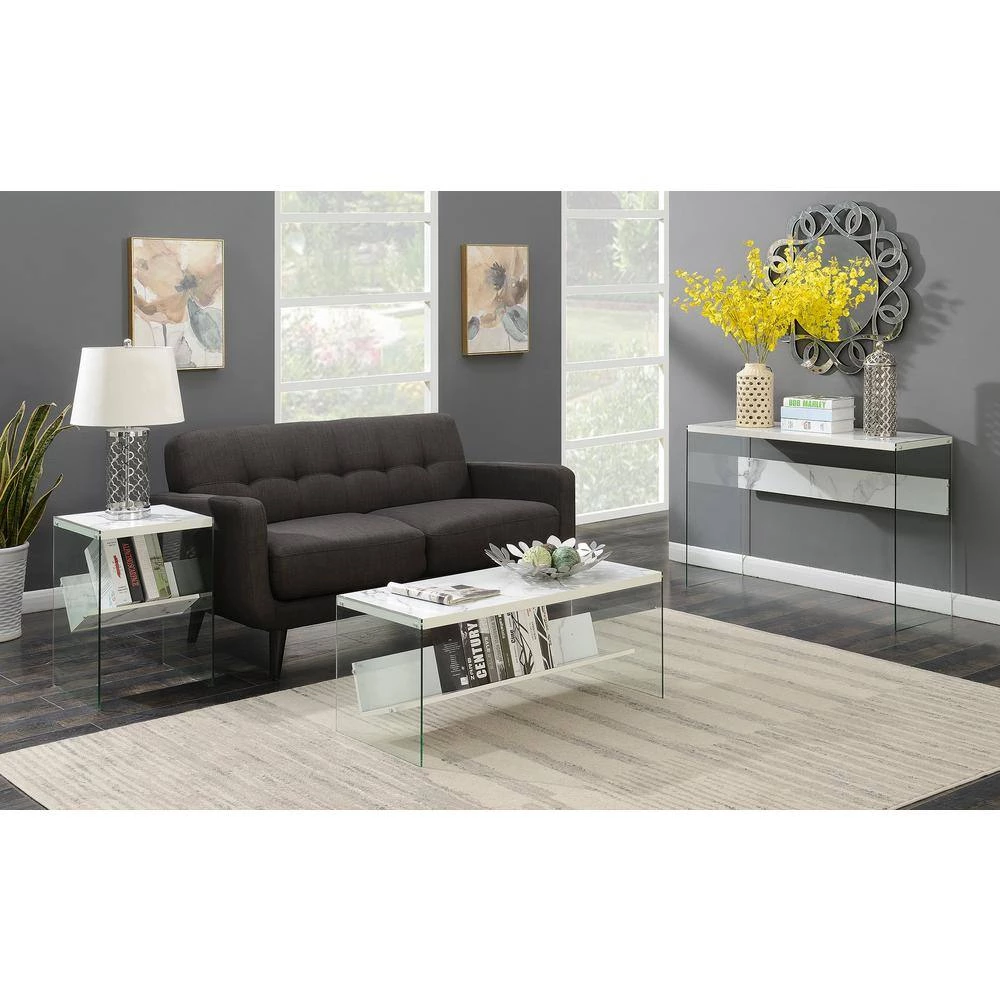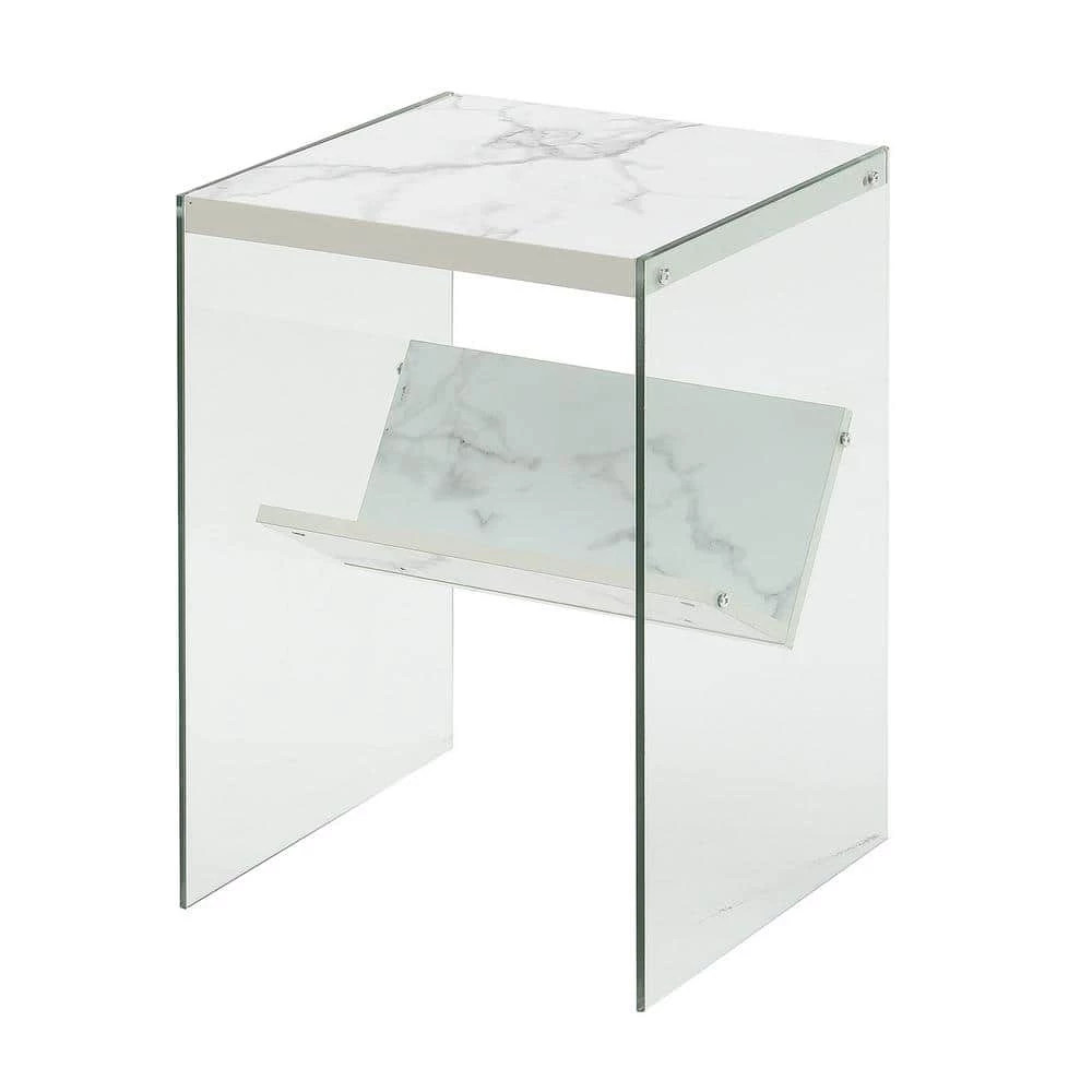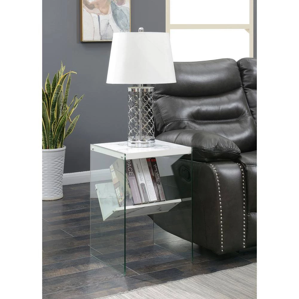 Keep your essentials close with the SoHo End Table with Shelf by Convenience Concepts. The minimalistic modern design is ideal for upgrading any living space in style. This piece is constructed with tempered glass sides and a sturdy surface top perfect for holding your remotes, electronics, and current reading material. The clear glass sides ensure magazines or books that are stored on the lower shelf are sure to be featured pieces in your room of choice. Each tier of shelving is built from particleboard, hollow core, and melamine. Shop additional contemporary pieces from the Soho collection by Convenience Concepts, each sold separately.