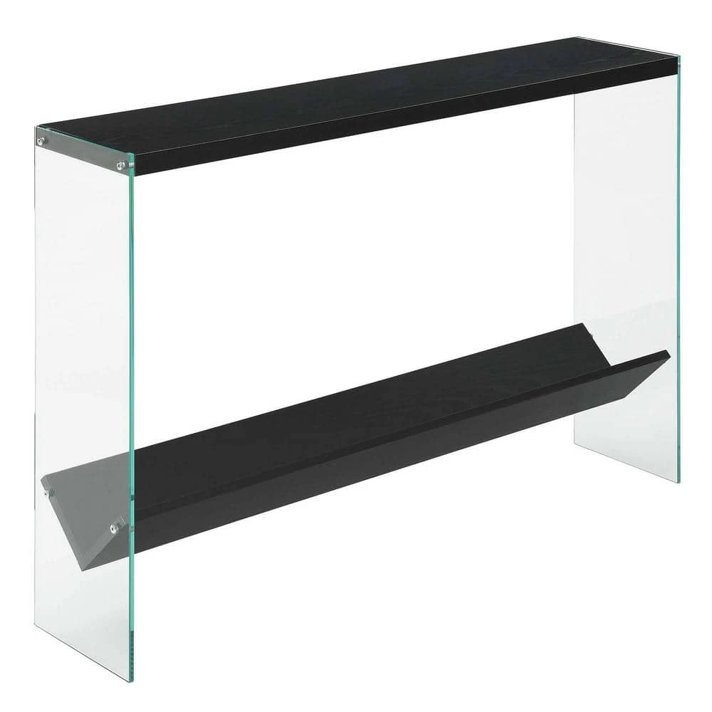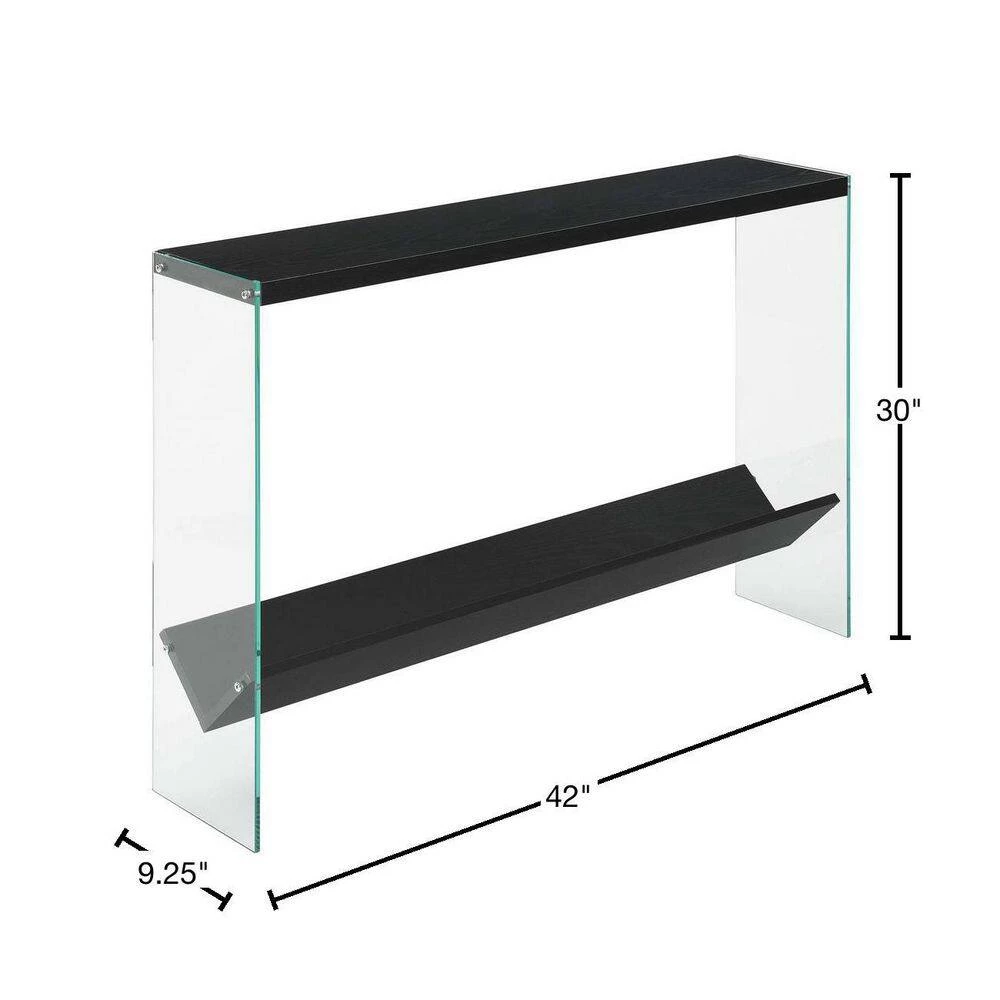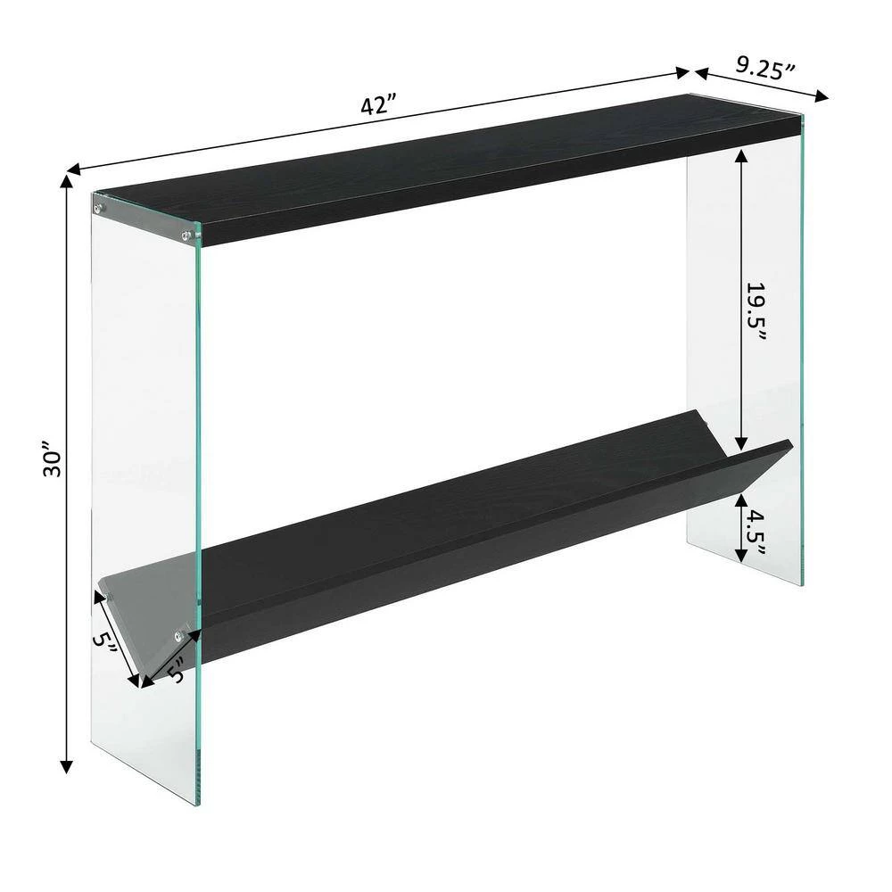Ever been in a win win situation. You will soon with the SoHo V Console Table by Convenience Concepts. Not only does it optimize your-storage and display space; but it also adds visual space thanks to its glass frame. The tempered clear glass also creates the magical illusion of floating-shelves; making this 2-tier unit chic. Its modern contemporary style will update your home decor instantly. With-shelves crafted from honeycomb particle board that are finished with a rich melamine paper; this-piece was engineered with durability and easy maintenance in mind. The top and bottom-shelves provide enough room for all your collectibles. Do not take for granted its versatility and set up in your living room; home study or entryway and witness as its functionality unfolds. Enjoy right after delivery with its simple 4 step assembly today. Pair with additional furniture items from the SoHo Collection by Convenience Concepts. Each sold separately.