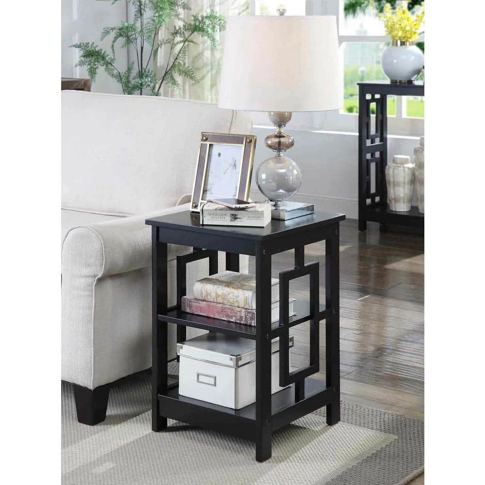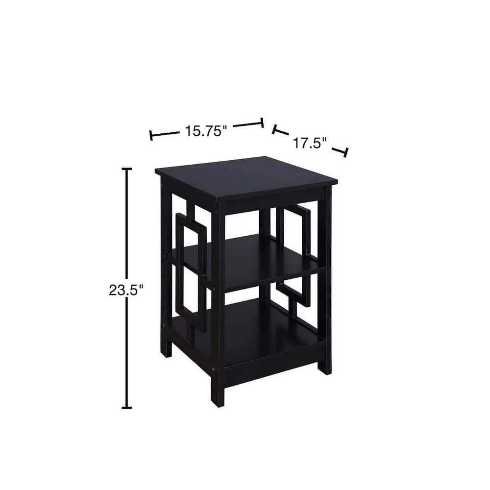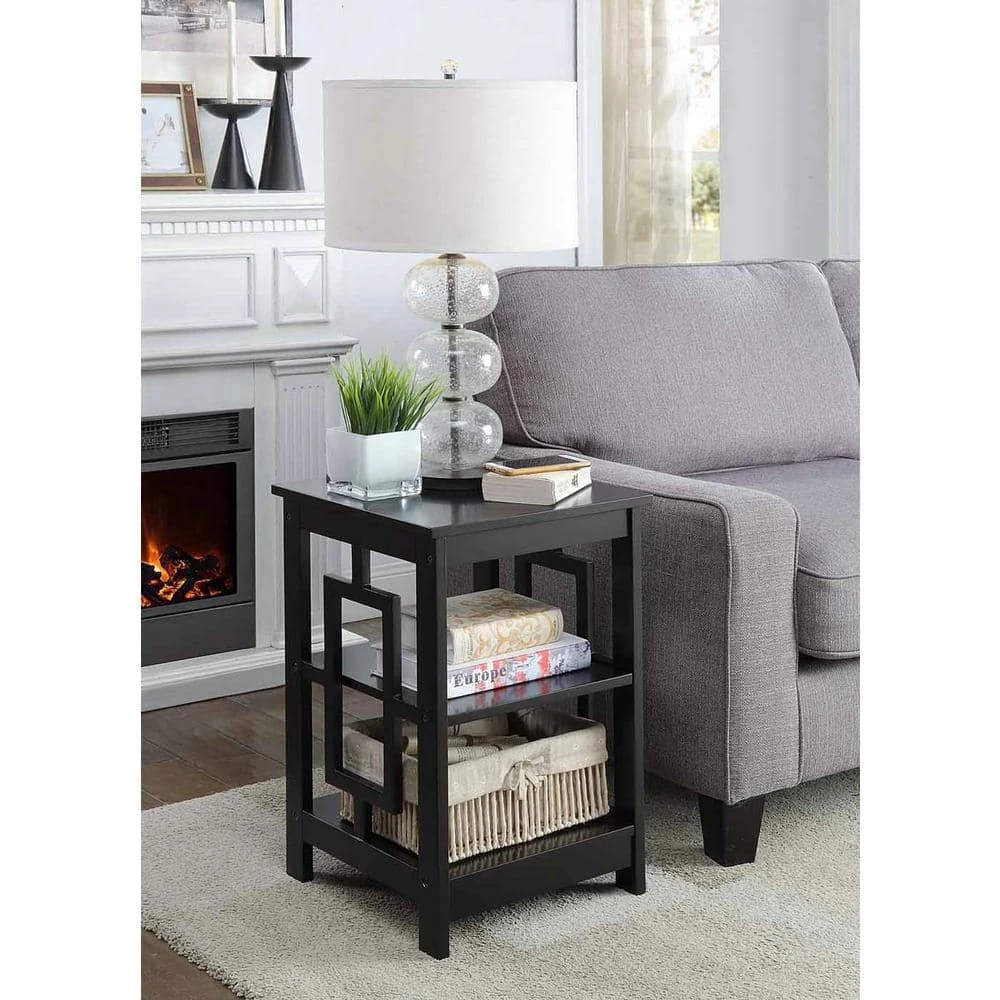 Reinvent your living room with the Town Square End Table with Shelves by Convenience Concepts. This simple yet eye-catching end table showcases an Asian-inspired design with its unique square side panels. Two additional shelves provide convenient storage or display space to meet one’s entertainment and storage needs. This carefully crafted unit is constructed from MDF and finished with non-lead-based paint for safe, long-term use. Coordinate this end table with additional pieces from the Town Square Collection by Convenience Concepts, each sold separately.