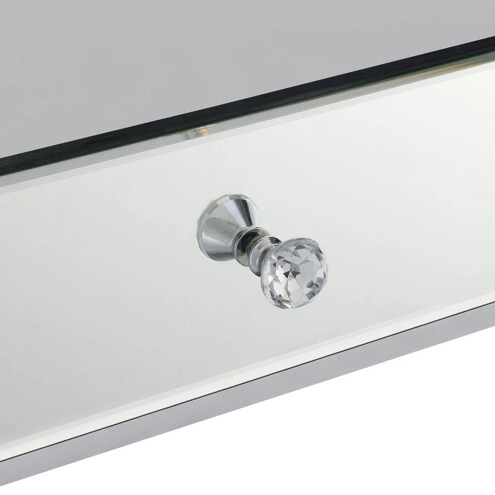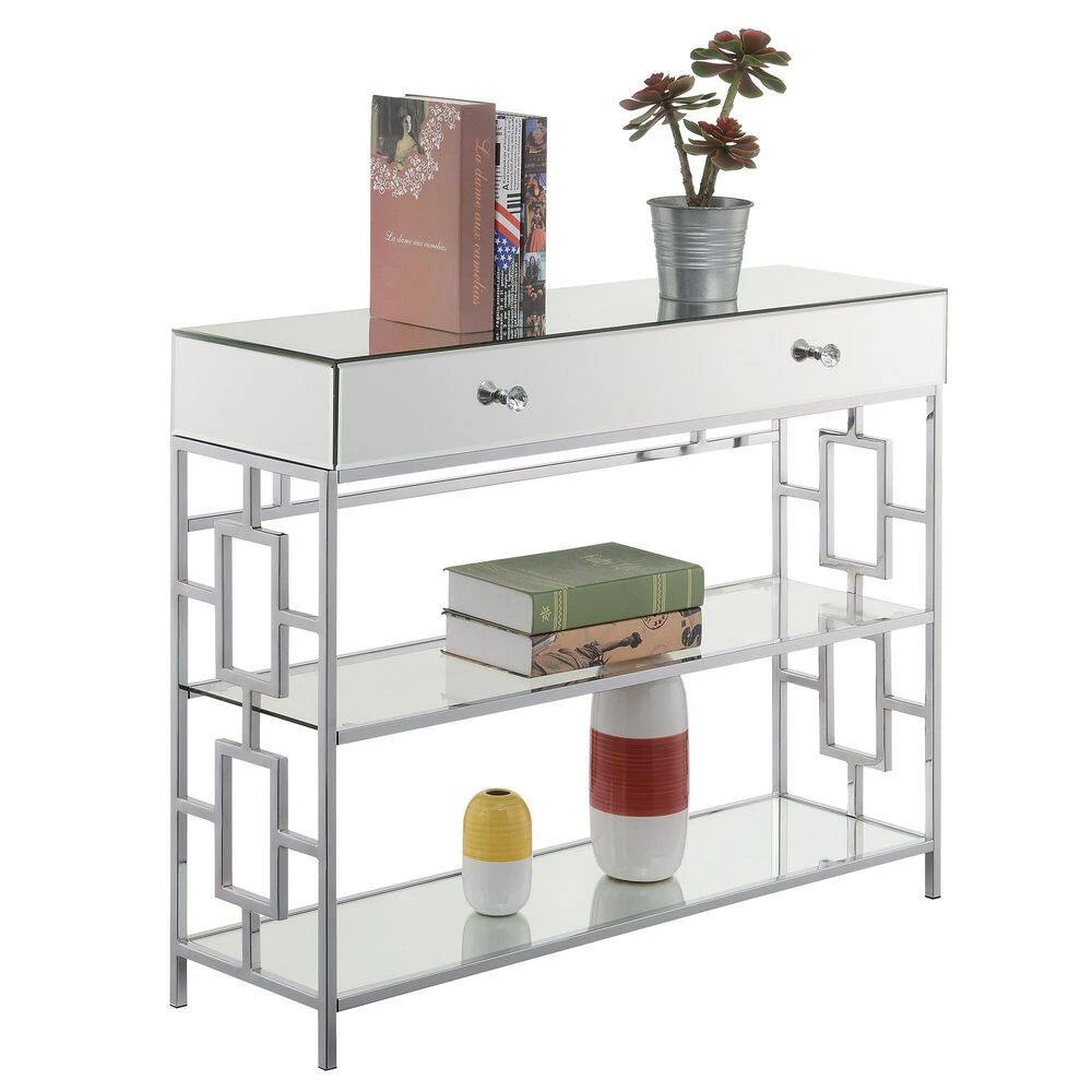 Add sparkle and glam to your living room space with the Town Square 1 Drawer Mirrored Console Table with Shelves by Convenience Concepts. This console table is complete with three tiers of shelving and a large drawer with faux crystal knobs to store unsightly accessories. Featuring a glass mirror tabletop that is sure to tie together your luxurious furniture collection. Thanks to the open concept side design, displayed decorative items will not go unnoticed. The middle tier shelf is made of tempered glass and the bottom tier is crafted from mirrored glass for easy maintenance. The frame of this console table is made of chrome metal that is sure to stand the test of time. Add beautiful coordinating pieces from the Town Square Chrome Collection from Convenience Concepts, each sold separately.