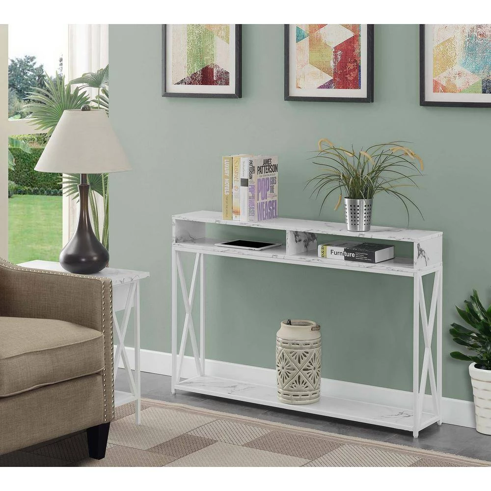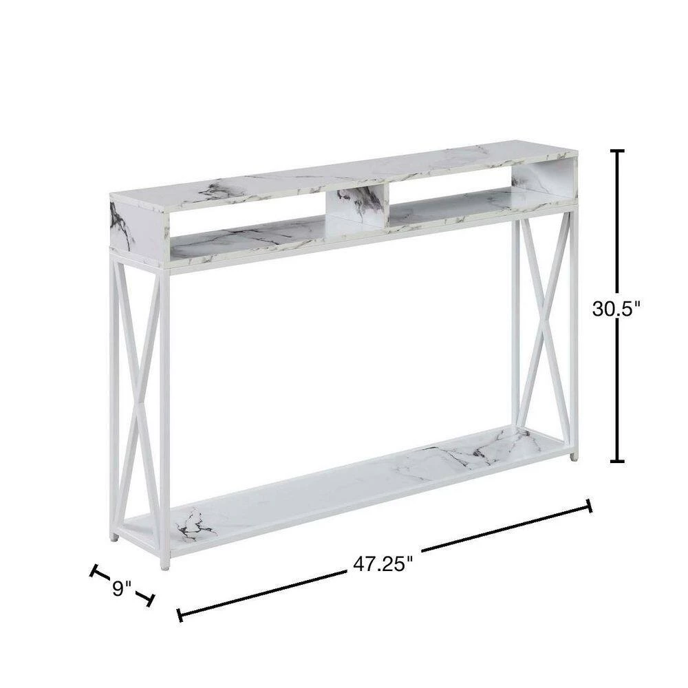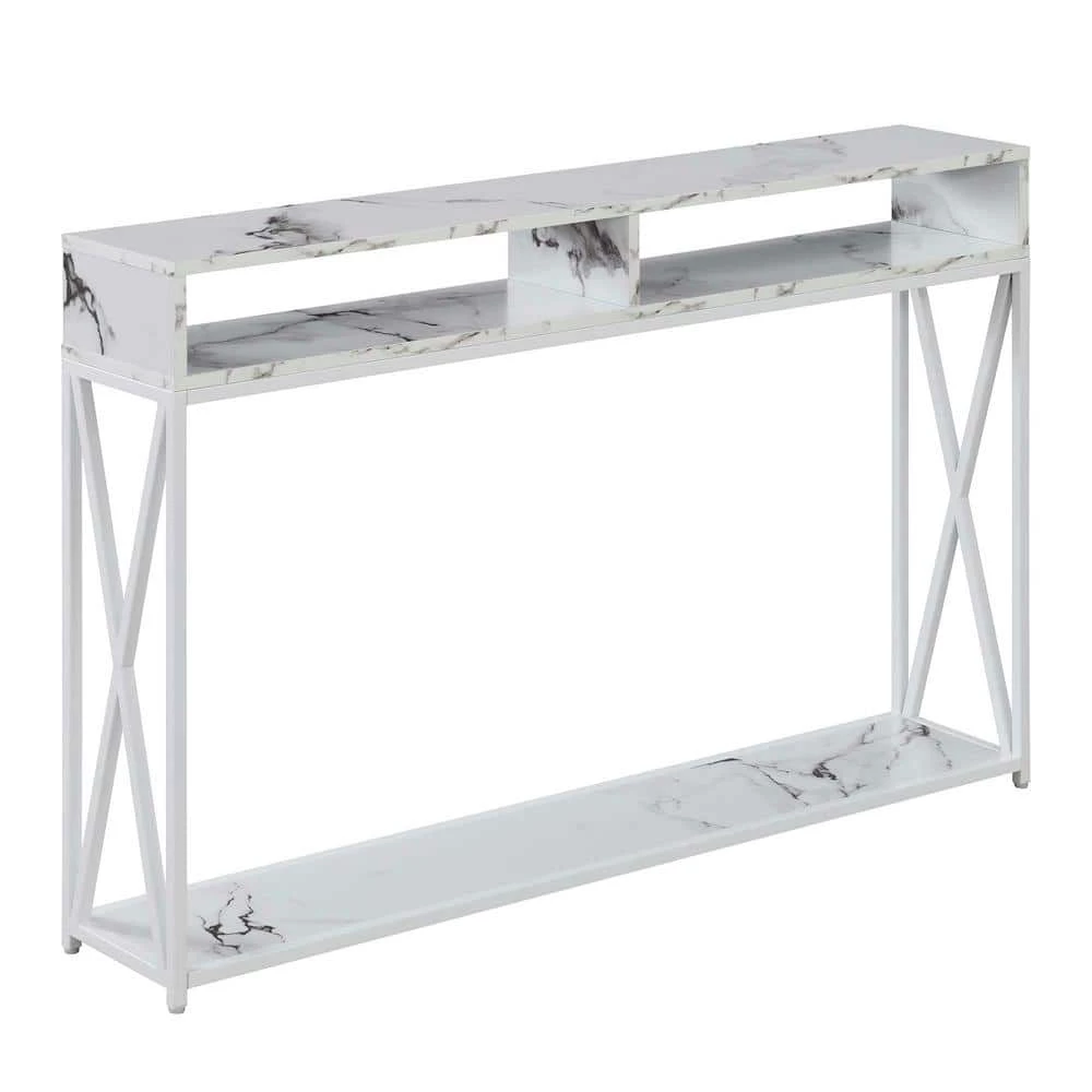 The Tucson Deluxe 2-Tier Console Table is the perfect addition for any home. Featuring 2-open compartments you can store anything from books to collectibles. Also featuring a bottom shelf for additional-storage and display. The powder coated metal frame ensures stability and durability. Available in multiple finishes this console will complete the look of any decor.