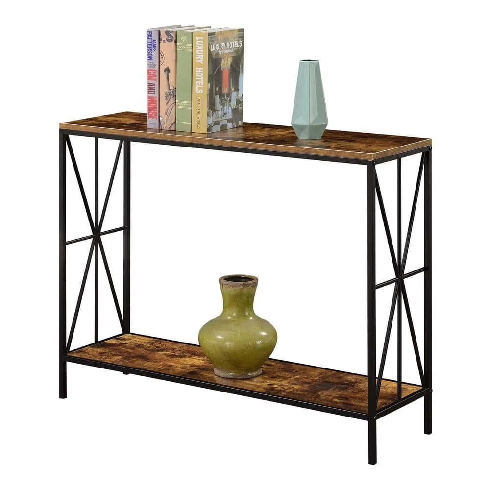 Add some flair to your home with the Tucson Starburst Console Table with Shelf by Convenience Concepts. This table offers much versatility and can be displayed in the entryway, hallway or living room. The star like crisscross frame of the Tucson Starburst Console Table with Shelf is sure to make a statement in any room! This unit features generous top surface space and includes a bottom shelf that provides additional space for display. The shelves are manufactured from particle board and the sturdy frame is crafted from powder-coated metal. Shop the complete Tucson Collection by Convenience Concepts, each sold separately.