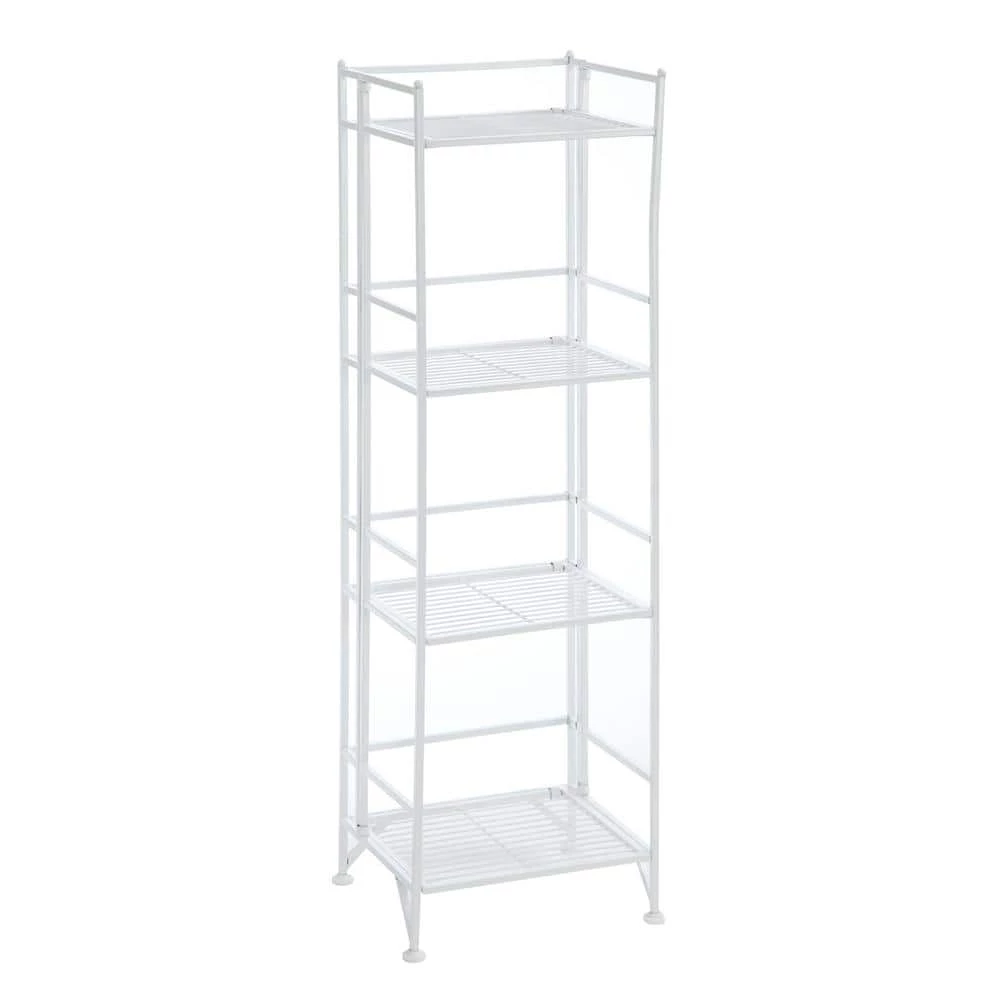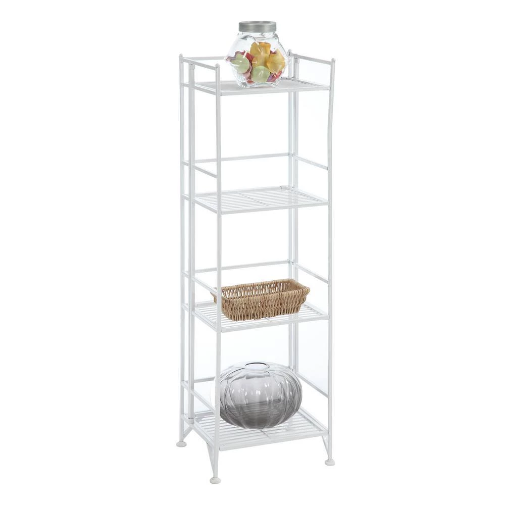 The open shelves of the Designs2Go 4-Tier Folding Metal Shelf brings you easy storage access. Featuring a fold away design that is made to meet your space needs while providing durable and efficient furniture. This shelving unit will add a bold touch to any room.